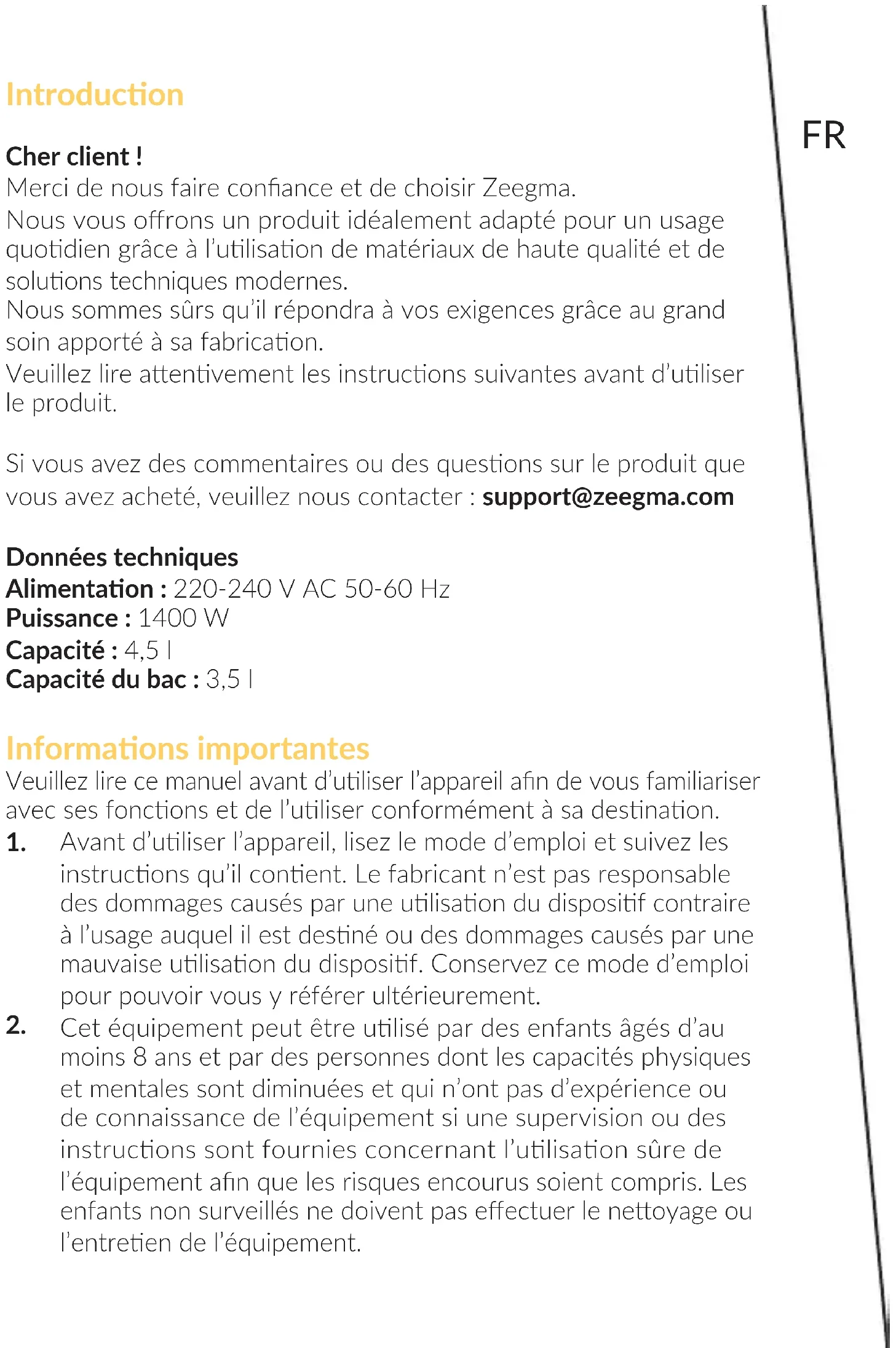 Le par del disposivo a contao con gli alimen possono essere lavate in lavastoviglie. Le immagini hanno caraere illustravo, l’aspeo reale dei prodo può dierire da quello presentato nelle immagini.FR Introducon Cher client ! Merci de nous faire conance et de choisir Zeegma. Nous vous orons un produit idéalement adapté pour un usage quodien grâce à l’ulisaon de matériaux de haute qualité et de soluons techniques modernes. Nous sommes sûrs qu’il répondra à vos exigences grâce au grand soin apporté à sa fabricaon. Veuillez lire aenvement les instrucons suivantes avant d’uliser le produit. Si vous avez des commentaires ou des quesons sur le produit que vous avez acheté, veuillez nous contacter : support@zeegma.com Données techniques Alimentaon : 220-240 V AC 50-60 Hz Puissance : 1400 W Capacité : 4,5 l Capacité du bac : 3,5 l Informaons importantes Veuillez lire ce manuel avant d’uliser l’appareil an de vous familiariser avec ses foncons et de l’uliser conformément à sa desnaon.