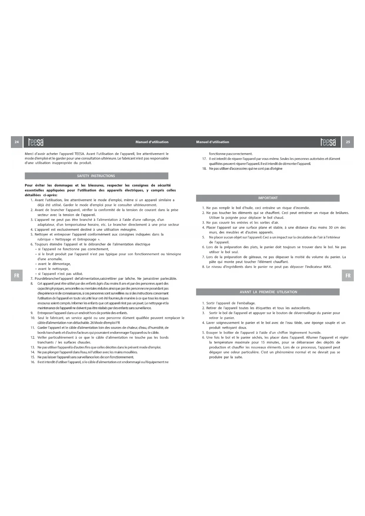 Merci d’avoir acheter l’appareil TEESA. Avant l’utilisation de l’appareil, lire attentivement le mode d’emploi et le garder pour une consultation ultérieure. Le fabricant n’est pas responsable d’une utilisation inappropriée du produit. fonctionne pascorrectement.