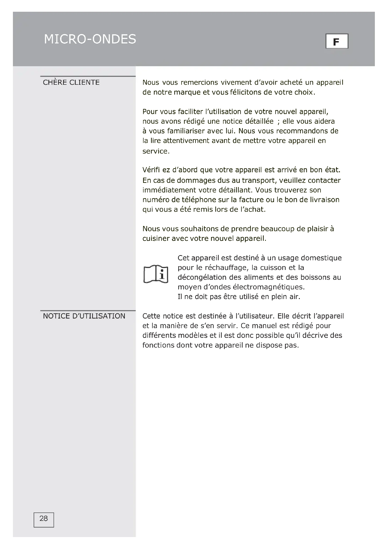 elle vous aidera à vous familiariser avec lui. Nous vous recommandons de la lire attentivement avant de mettre votre appareil en service. Vérifi ez d’abord que votre appareil est arrivé en bon état. En cas de dommages dus au transport, veuillez contacter immédiatement votre détaillant. Vous trouverez son numéro de téléphone sur la facture ou le bon de livraison qui vous a été remis lors de l’achat. Nous vous souhaitons de prendre beaucoup de plaisir à cuisiner avec votre nouvel appareil. Cet appareil est destiné à un usage domestique pour le réchauffage, la cuisson et la décongélation des aliments et des boissons au moyen d’ondes électromagnétiques. Il ne doit pas être utilisé en plein air.