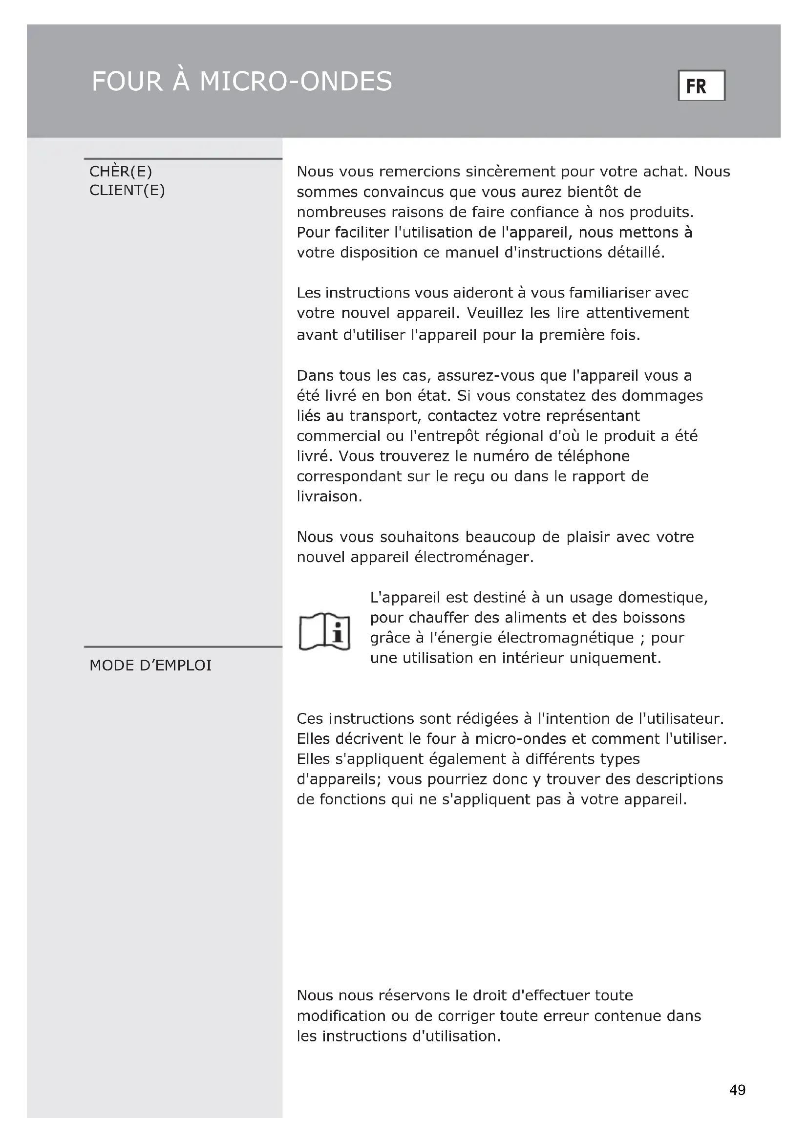 Ces i nstructions sont rédigées à l'intention de l'utilisateur. Elles décrivent le four à micro-ondes et comment l'utiliser. Elles s'appliquent également à différents types d'appareils; vous pourriez donc y trouver des descriptions de fonctions qui ne s'appliquent pas à votre appareil. Nous nous réservons le droit d'effectuer toute modification ou de corriger toute erreur contenue dans les instructions d'utilisation.
