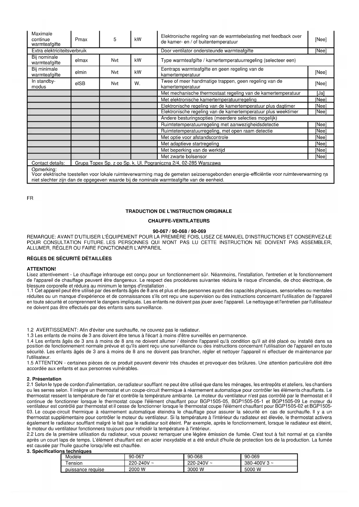 CHAUFFE-VENTILATEURS 90-067 / 90-068 / 90-069 REMARQUE: AVANT D'UTILISER L'ÉQUIPEMENT POUR LA PREMIÈRE FOIS, LISEZ CE MANUEL D'INSTRUCTIONS ET CONSERVEZ-LE POUR CONSULTATION FUTURE. LES PERSONNES QUI N'ONT PAS LU CETTE INSTRUCTION NE DOIVENT PAS ASSEMBLER, ALLUMER, RÉGLER OU FAIRE FONCTIONNER L'APPAREIL RÈGLES DE SÉCURITÉ DÉTAILLÉES ATTENTION! Lisez attentivement - Le chauffage infrarouge est conçu pour un fonctionnement sûr. Néanmoins, l'installation, l'entretien et le fonctionnement de l'appareil de chauffage peuvent être dangereux. Le respect des procédures suivantes réduira le risque d'incendie, de choc électrique, de blessure corporelle et réduira au minimum le temps d'installation . 1.1 Cet appareil peut être utilisé par des enfants âgés de 8 ans et plus et des personnes ayant des capacités physiques, sensorielles ou mentales réduites ou un manque d'expérience et de connaissances s'ils ont reçu une supervision ou des instructions concernant l'utilisation de l'appareil en toute sécurité et comprennent le dangers impliqués. Les enfants ne doivent pas jouer avec l'appareil. Le nettoyage et l'entretien par l'utilisateur ne doivent pas être effectués par des enfants sans surveillance.