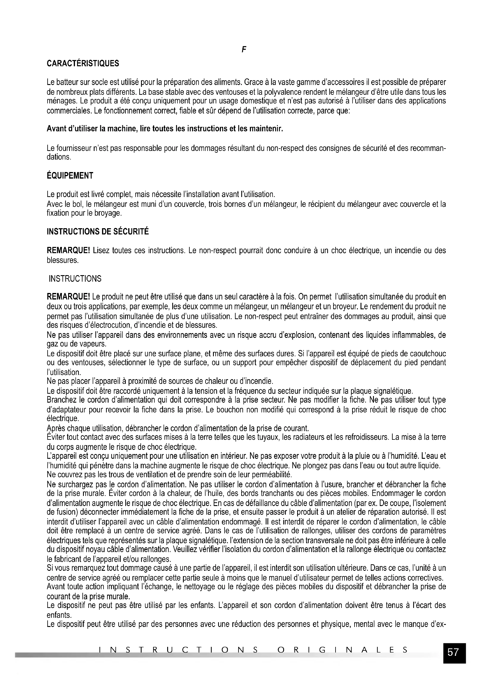 REMARQUE! Lisez toutes ces instructions. Le non-respect pourrait donc conduire à un choc électrique, un incendie ou des blessures. INSTRUCTIONS REMARQUE! Le produit ne peut être utilisé que dans un seul caractère à la fois. On permet l’utilisation simultanée du produit en deux ou trois applications, par exemple, les deux comme un mélangeur, un mélangeur et un broyeur. Le rendement du produit ne permet pas l’utilisation simultanée de plus d’une utilisation. Le non-respect peut entraîner des dommages au produit, ainsi que des risques d’électrocution, d’incendie et de blessures. Ne pas utiliser l’appareil dans des environnements avec un risque accru d’explosion, contenant des liquides inflammables, de gaz ou de vapeurs. Le dispositif doit être placé sur une surface plane, et même des surfaces dures. Si l’appareil est équipé de pieds de caoutchouc ou des ventouses, sélectionner le type de surface, ou un support pour empêcher dispositif de déplacement du pied pendant l’utilisation. Ne pas placer l’appareil à proximité de sources de chaleur ou d’incendie. Le dispositif doit être raccordé uniquement à la tension et la fréquence du secteur indiquée sur la plaque signalétique. Branchez le cordon d’alimentation qui doit correspondre à la prise secteur. Ne pas modifier la fiche. Ne pas utiliser tout type d’adaptateur pour recevoir la fiche dans la prise. Le bouchon non modifié qui correspond à la prise réduit le risque de choc électrique. Après chaque utilisation, débrancher le cordon d’alimentation de la prise de courant. Éviter tout contact avec des surfaces mises à la terre telles que les tuyaux, les radiateurs et les refroidisseurs. La mise à la terre du corps augmente le risque de choc électrique. L’appareil est conçu uniquement pour une utilisation en intérieur. Ne pas exposer votre produit à la pluie ou à l’humidité. L’eau et l’humidité qui pénètre dans la machine augmente le risque de choc électrique. Ne plongez pas dans l’eau ou tout autre liquide. Ne couvrez pas les trous de ventilation et de prendre soin de leur perméabilité. Ne surchargez pas le cordon d’alimentation. Ne pas utiliser le cordon d’alimentation à l’usure, brancher et débrancher la fiche de la prise murale. Éviter cordon à la chaleur, de l’huile, des bords tranchants ou des pièces mobiles. Endommager le cordon d’alimentation augmente le risque de choc électrique. En cas de défaillance du câble d’alimentation (par ex. De coupe, l’isolement de fusion) déconnecter immédiatement la fiche de la prise, et ensuite passer le produit à un atelier de réparation autorisé. Il est interdit d’utiliser l’appareil avec un câble d’alimentation endommagé. Il est interdit de réparer le cordon d’alimentation, le câble doit être remplacé à un centre de service agréé. Dans le cas de l’utilisation de rallonges, utiliser des cordons de paramètres électriques tels que représentés sur la plaque signalétique. l’extension de la section transversale ne doit pas être inférieure à celle du dispositif noyau câble d’alimentation. Veuillez vérifier l’isolation du cordon d’alimentation et la rallonge électrique ou contactez le fabricant de l’appareil et/ou rallonges. Si vous remarquez tout dommage causé à une partie de l’appareil, il est interdit son utilisation ultérieure. Dans ce cas, l’unité à un centre de service agréé ou remplacer cette partie seule à moins que le manuel d’utilisateur permet de telles actions correctives. Avant toute action impliquant l’échange, le nettoyage ou le réglage des pièces mobiles du dispositif et débrancher la prise de courant de la prise murale. Le dispositif ne peut pas être utilisé par les enfants. L’appareil et son cordon d’alimentation doivent être tenus à l’écart des enfants. Le dispositif peut être utilisé par des personnes avec une réduction des personnes et physique, mental avec le manque d’ex-58 INSTRUCTIONS ORIGINALES