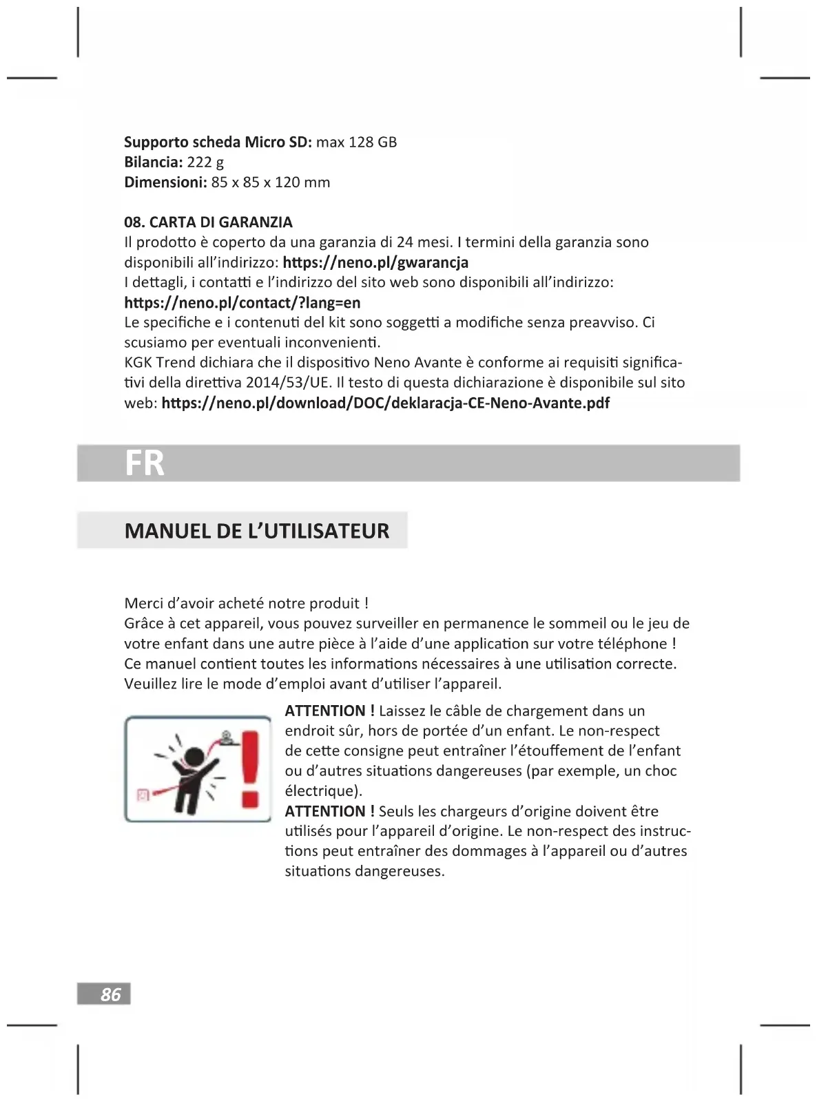 Le produit est couvert par une garane de 24 mois. Les condions de la garane peuvent être consultées à l’adresse suivante: hps://neno.pl/gwarancja Les détails, le contact et l’adresse du site web sont disponibles à l’adresse suivante: hps://neno.pl/contact/?lang=en Les spécicaons et le contenu du kit peuvent être modiés sans préavis. Nous nous excusons pour tout inconvénient. KGK Trend déclare que ce disposif Neno Avante est conforme aux exigences signi- caves de la direcve 2014/53/UE. Le texte de cee déclaraon peut être consulté sur le site web: hps://neno.pl/download/DOC/deklaracja-CE-Neno-Avante.pdf93