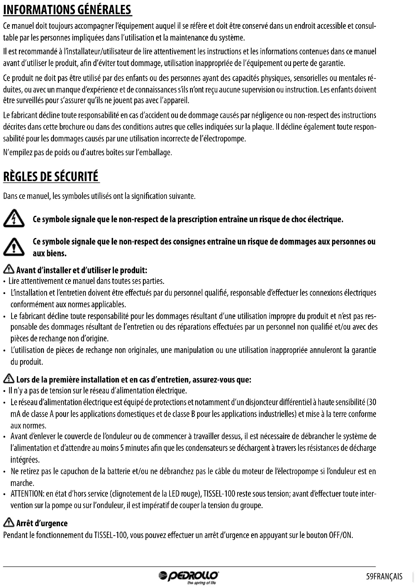 - ATTENTION: en état d’hors service (clignotement de la LED rouge), TISSEL-100 reste sous tension; avant d’eectuer toute inter- vention sur la pompe ou sur l’onduleur, il est impératif de couper la tension du groupe. Arrêt d’urgence Pendant le fonctionnement du TISSEL-100, vous pouvez eectuer un arrêt d’urgence en appuyant sur le bouton OFF/ON.60 | FRANÇAIS