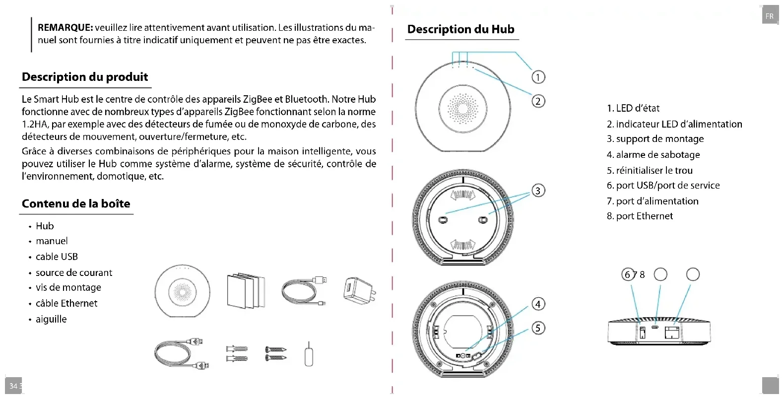 REMARQUE: veuillez lire attentivement avant utilisation. Les illustrations du ma- nuel sont fournies à titre indicatif uniquement et peuvent ne pas être exactes. Description du produit Le Smart Hub est le centre de contrôle des appareils ZigBee et Bluetooth. Notre Hub fonctionne avec de nombreux types d’appareils ZigBee fonctionnant selon la norme 1.2HA, par exemple avec des détecteurs de fumée ou de monoxyde de carbone, des détecteurs de mouvement, ouverture/fermeture, etc. Grâce à diverses combinaisons de périphériques pour la maison intelligente, vous pouvez utiliser le Hub comme système d’alarme, système de sécurité, contrôle de l’environnement, domotique, etc. Contenu de la boîte