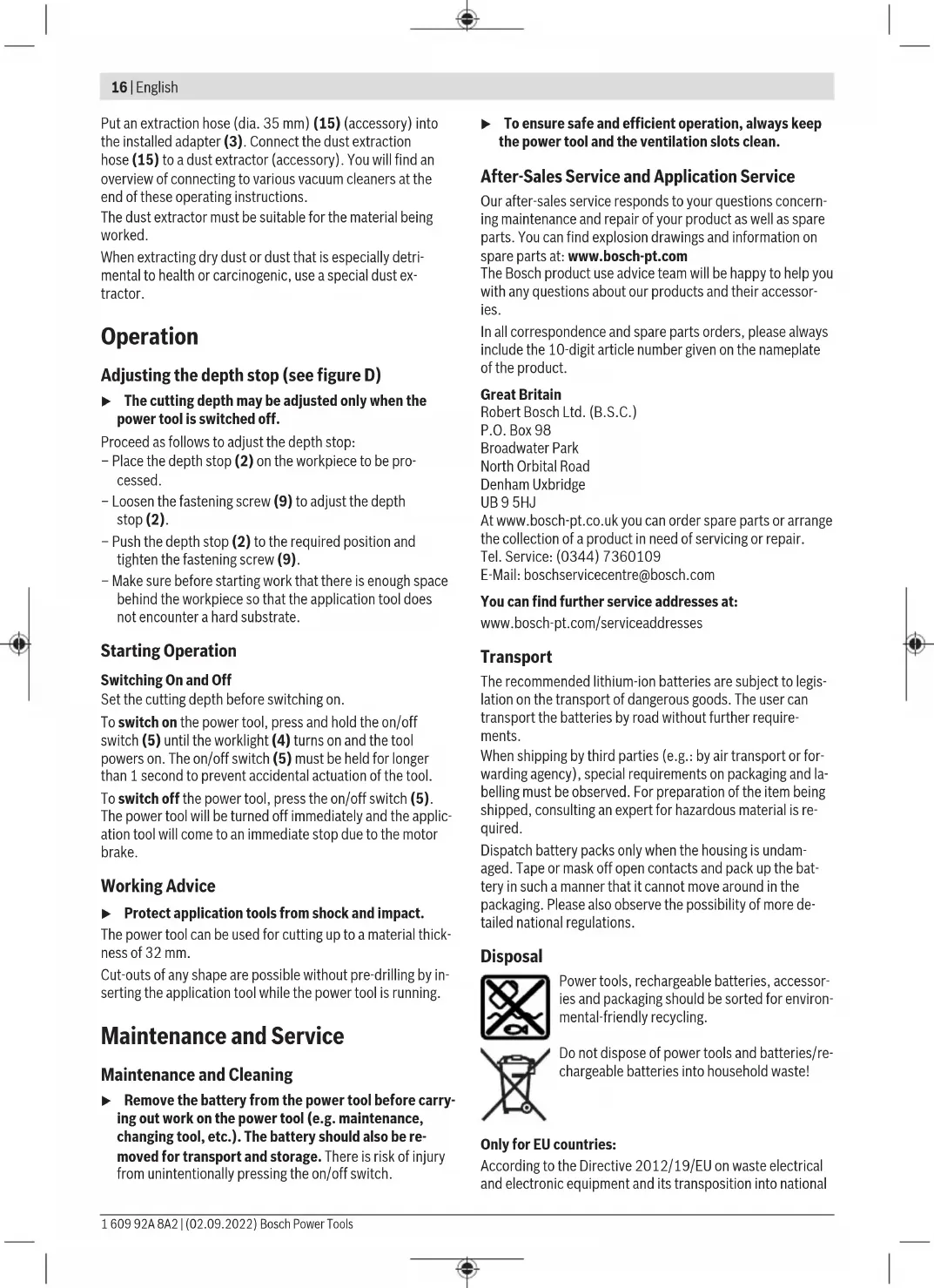 The vibration level and noise emission value given in these instructions have been measured in accordance with a standardised measuring procedure and may be used to com- pare power tools. They may also be used for a preliminary estimation of vibration and noise emissions. The stated vibration level and noise emission value repres- ent the main applications of the power tool. However, if the power tool is used for other applications, with different ap- plication tools or is poorly maintained, the vibration level and noise emission value may differ. This may significantly increase the vibration and noise emissions over the total working period. To estimate vibration and noise emissions accurately, the times when the tool is switched off or when it is running but not actually being used should also be taken into account. This may significantly reduce vibration and noise emissions over the total working period. Implement additional safety measures to protect the oper- ator from the effects of vibration, such as servicing the power tool and application tools, keeping their hands warm, and organising workflows correctly. Rechargeable battery Bosch sells some cordless power tools without a re- chargeable battery. You can tell whether a rechargeable bat- tery is included with the power tool by looking at the pack- aging. Charging the battery u Use only the chargers listed in the technical data. Only these chargers are matched to the lithium-ion battery of your power tool. Note: Lithium-ion rechargeable batteries are supplied par- tially charged according to international transport regula- tions. To ensure full rechargeable battery capacity, fully charge the rechargeable battery before using your tool for the first time. Inserting the Battery Push the charged battery into the battery holder until it clicks into place. Removing the Battery To remove the rechargeable battery, press the battery re- lease button and pull the battery out. Do not use force to do this. The rechargeablebattery has two locking levels to prevent the battery from falling out if the battery releasebutton is pressed unintentionally. The rechargeable battery is held in place by a spring when fitted in the power tool. Battery charge indicator The green LEDs on the battery charge indicator indicate the state of charge of the battery. For safety reasons, it is only possible to check the state of charge when the power tool is not in operation. Press the button for the battery charge indicator or to show the state of charge. This is also possible when the bat- tery is removed. If no LED lights up after pressing the button for the battery charge indicator, then the battery is defective and must be replaced. Battery model GBA 18V... LED Capacity 3× continuous green light 60–100% 2× continuous green light 30–60% 1× continuous green light 5–30% 1× flashing green light 0–5% Battery model ProCORE18V... LED Capacity 5 × continuous green light 80–100% 4 × continuous green light 60–80% 3 × continuous green light 40–60% 2 × continuous green light 20–40% 1 609 92A 8A2 | (02.09.2022) Bosch Power ToolsEnglish | 15 LED Capacity 1 × continuous green light 5–20% 1 × flashing green light 0–5% Recommendations for Optimal Handling of the Battery Protect the battery against moisture and water. Only store the battery within a temperature range of −20 to 50°C. Do not leave the battery in your car in the summer, for example. Occasionally clean the ventilation slots on the battery using a soft brush that is clean and dry. A significantly reduced operating time after charging indic- ates that the battery has deteriorated and must be replaced. Follow the instructions on correct disposal. Fitting u Remove the battery from the power tool before carry- ing out work on the power tool (e.g. maintenance, changing tool, etc.). The battery should also be re- moved for transport and storage. There is risk of injury from unintentionally pressing the on/off switch. Changing the tool u Wearing protective gloves is recommended for in- stalling and replacing application tools. Original application tools from the extensive range of Bosch accessories are available from your specialist dealer. Changing the collet (seefigureA) Remove the fastening screw(9) and remove the depth stop(2) together with the dust extraction adapter(3). Depending on the size of the application tool used, you must change the collet nut(12) with the collet(11) before use. If the right collet for your application is already installed, fol- low the work steps in the following section. The collet(11) must sit in the output shaft with a small amount of play. The collet nut(12) must be easy to fit. If the collet nut or collet is damaged, replace it immediately. Press and hold the spindle lock button(8). If necessary, turn the motor spindle manually until it is locked in place. Unscrew the collet nut(12) with the open-ended spanner(13) by turning in the direction of rotation ➊. Release the spindle lock button. If required, clean all the parts you want to fit with a soft brush or by blowing them clean with compressed air before assembling them. Place the new collet nut on the output shaft(14). Gently tighten the collet nut by turning in the direction of ro- tation ➋. u Never tighten the collet with the collet nut if no applic- ation tool is installed. The collet may otherwise become damaged. Insert the depth stop(2) together with the dust extraction adapter(3) into the power tool and secure with the fasten- ing screw(9). Inserting the application tool (see figureB) u Wearing protective gloves is recommended for in- stalling and replacing application tools. Application tools are available in a wide variety of designs and qualities depending on the intended application. Application tools with a guide tip are suitable for flush-cut- ting gypsum plasterboards. Application tools with a spiral groove are suitable for cutting OSB panels, chipboards, plywood, foam and plastics. 