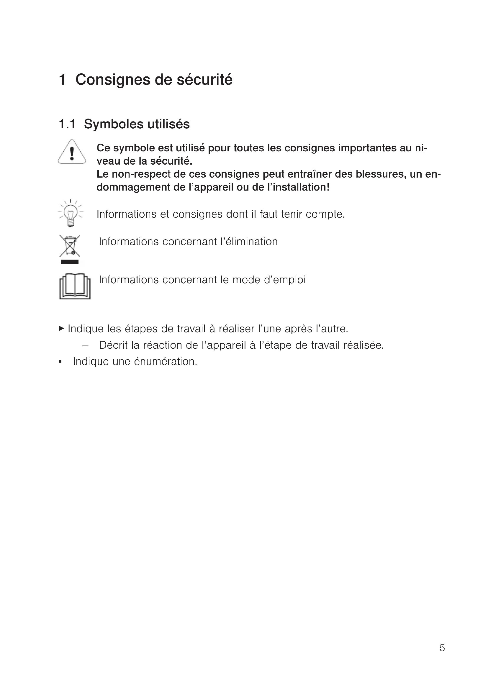 Ce symbole est utilisé pour toutes les consignes importantes au ni- veau de la sécurité. Le non-respect de ces consignes peut entraîner des blessures, un en- dommagement de l’appareil ou de l’installation! Informations et consignes dont il faut tenir compte. Informations concernant l’élimination Informations concernant le mode d’emploi