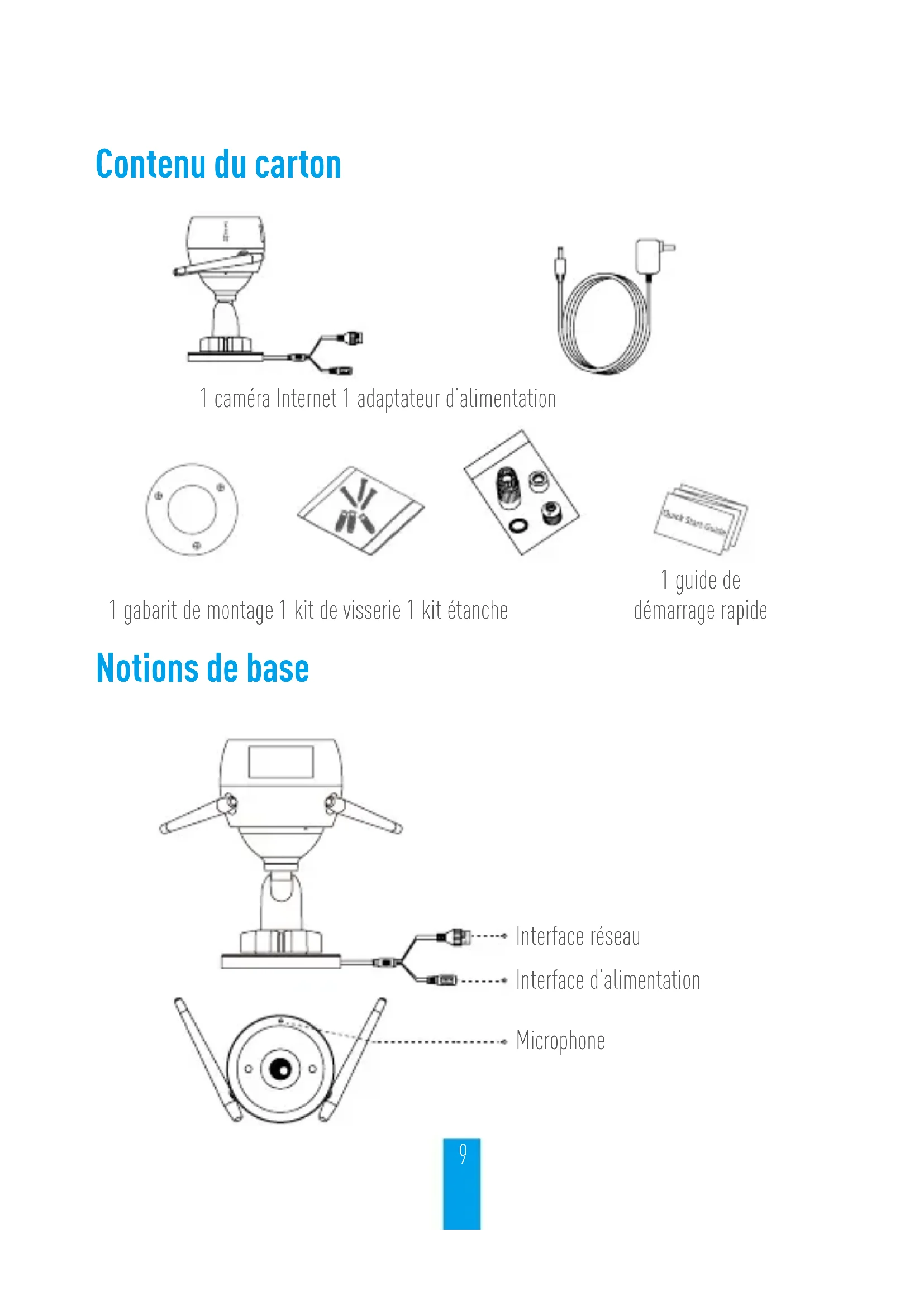 Ajuste del ángulo de vigilancia - Afloje el tornillo de ajuste. - Ajuste el ángulo de la cámara en el punto deseado. - Apriete el tornillo de ajuste. Tornillo de ajuste 0°-90° 0°-360°9 1 caméra Internet 1 adaptateur d’alimentation 1 gabarit de montage 1 kit de visserie 1 kit étanche 1 guide de démarrage rapide Notions de base Interface réseau Interface d’alimentation Microphone Contenu du carton10 Opérations Étape 1 Alimentation Raccordez la caméra à la prise de courant pour alimenter la caméra. Câble d’alimentation Prise d’alimentation Étape 2 Mise en place de la caméra
