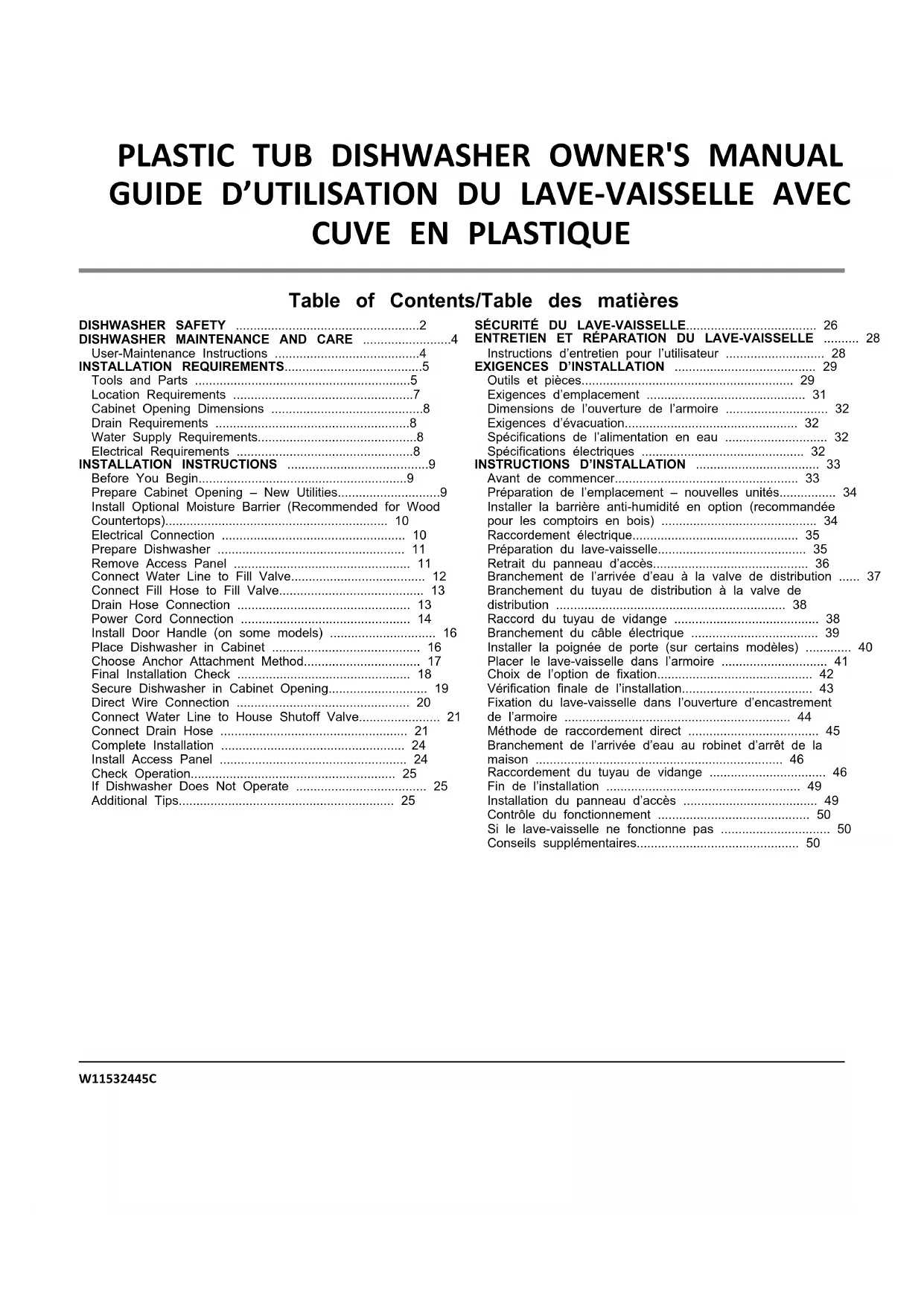 po (38 mm) dans l’armoire REMARQUE : Nécessaire pour les armoires métalliques Ensemble du cordon d’alimentation L’ensemble comprend habituellement un cordon d’alimentation, un serre-câbles métallique, un œillet et des connecteurs de fils. (Droit : No de pièce Whirlpool 4317824, 90° : No de pièce Whirlpool W10278923RP). Pour s’assurer d’installer l’appareil correctement, consulter les instructions d’installation fournies avec l’ensemble. REMARQUE : S’assurer d’acheter uniquement des pièces et des accessoires Whirlpool certifiés par le fabricant de l’appareil. Il se peut que l’installation nécessite des pièces supplémentaires. Pour commander, consulter les coordonnées indiquées dans le guide de démarrage rapide. Exigences d’emplacement L’appareil doit être entièrement encastré (sur le dessus, les côtés, l’arrière et au sol) dès l’installation. Un ensemble de panneaux latéraux est disponible chez votre marchand pour l’installation du lave-vaisselle à l’extrémité d’une rangée d’armoires. Une barrière anti-humidité en option est également disponible pour l’installation sous un plan de travail en bois. Inspecter l’emplacement d’installation du lave-vaisselle. Il doit comporter les caractéristiques suivantes : "Accès facile pour chargement et déchargement de la vaisselle. Dans le cas de l’installation dans un angle, on doit pouvoir établir un dégagement de 2 po (51 mm) ou plus entre le côté de la porte du lave-vaisselle et le mur ou l’armoire. " Facilité d’accès aux canalisations d’eau et d’évacuation et à la source d’électricité :