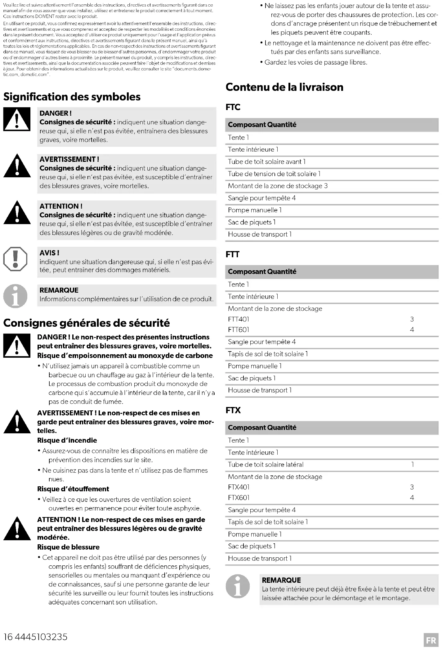 DANGER ! Consignes de sécurité : indiquent une situation dange- reuse qui, si elle n’est pas évitée, entraînera des blessures graves, voire mortelles. AVERTISSEMENT ! Consignes de sécurité : indiquent une situation dange- reuse qui, si elle n’est pas évitée, est susceptible d’entraîner des blessures graves, voire mortelles. ATTENTION ! Consignes de sécurité : indiquent une situation dange- reuse qui, si elle n’est pas évitée, est susceptible d’entraîner des blessures légères ou de gravité modérée. AVIS ! indiquent une situation dangereuse qui, si elle n’est pas évi- tée, peut entraîner des dommages matériels. REMARQUE Informations complémentaires sur l’utilisation de ce produit. Composant Quantité Tente 1 Tente intérieure 1 Tube de toit solaire avant 1 Tube de tension de toit solaire 1 Montant de la zone de stockage 3 Sangle pour tempête 4 Pompe manuelle 1 Sac de piquets 1 Housse de transport 1 Composant Quantité Tente 1 Tente intérieure 1 Montant de la zone de stockage FTT401 FTT601