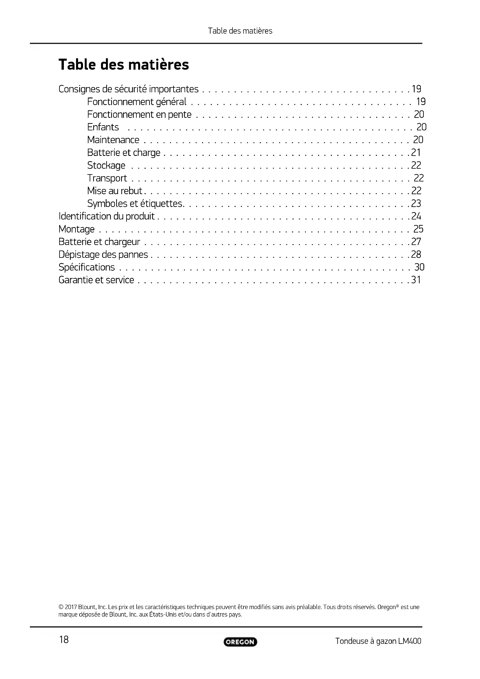 - Tondeuse à gazon LM400 Garantie et service Garantie et service Garanties Blount, Inc. garantit la totalité des outils sans fil et chargeurs de marque Oregon® pour une période de trois () ans et la totalité des batteries sans fil de marque Oregon® pour une période de deux () ans à compter de la date d'achat. Les outils sans fil, batteries et chargeurs de marque Oregon® sont garantis pour une période de deux () ans en cas d'utilisation à des fins commerciales. Cette garantie limitée s'applique aux produits fabriqués par Oregon® Cordless Tools System. Pendant la période de garantie, Blount s'engage à remplacer ou, à son gré, à réparer gratuitement, au bénéfice de l'acquéreur original uniquement, tout produit ou pièce jugés défectueux en raison d'un défaut matériel ou d'un vice de fabrication après examen par Blount. L'acquéreur se verra facturer l'ensemble des frais de transport et coûts de retrait de toute pièce à remplacer aux termes de la présente garantie. Pour enregistrer votre produit, rendez-vous à la section « support » du site OregonCordless.com. Informations relatives à nos services d'assistance et de maintenance Rendez-nous visite sur notre site Web OregonCordless.com pour obtenir des informations relatives à notre centre de services ou prenez contact avec notre service clients en appelant au