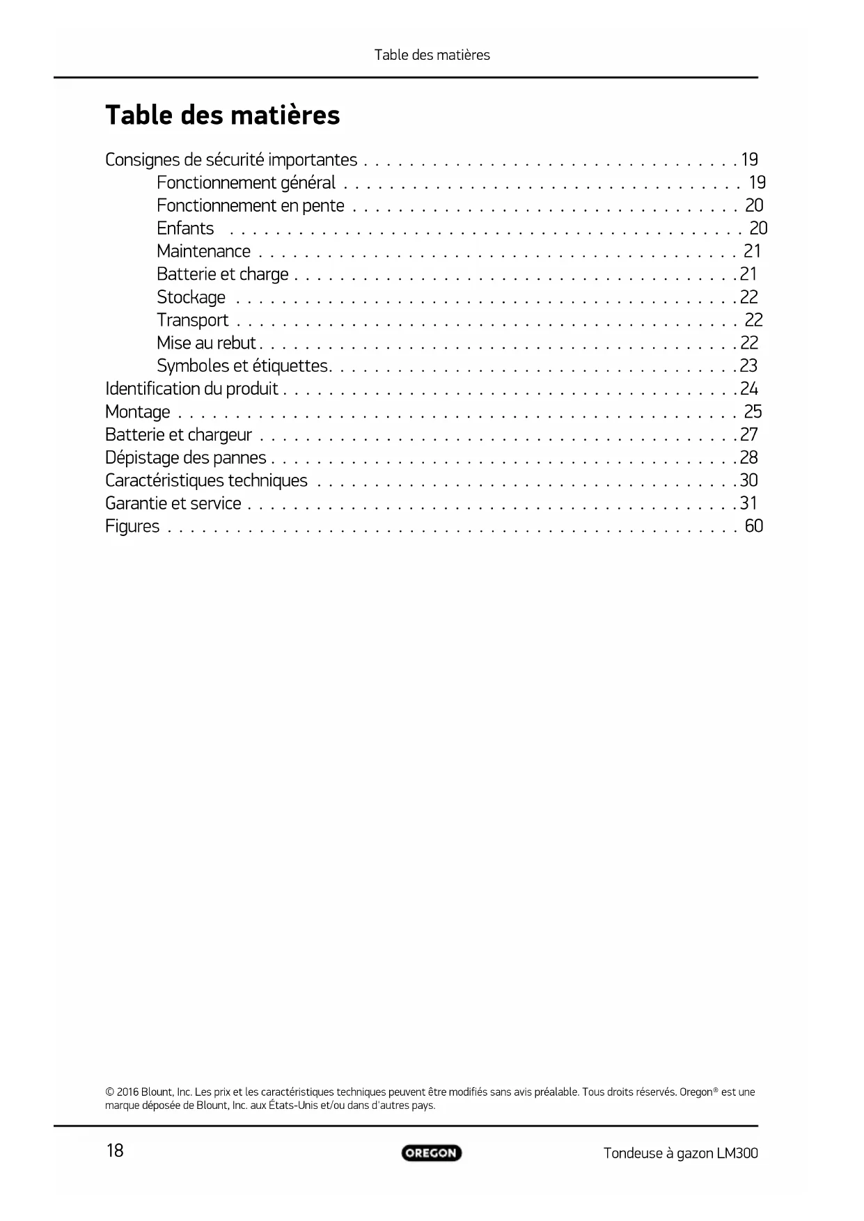 - Figures © Blount, Inc. Les prix et les caractéristiques techniques peuvent être modifiés sans avis préalable. Tous droits réservés. Oregon® est une marque déposée de Blount, Inc. aux États-Unis et/ou dans d'autres pays.19 Consignes de sécurité importantes Tondeuse à gazon LM300 p. 60