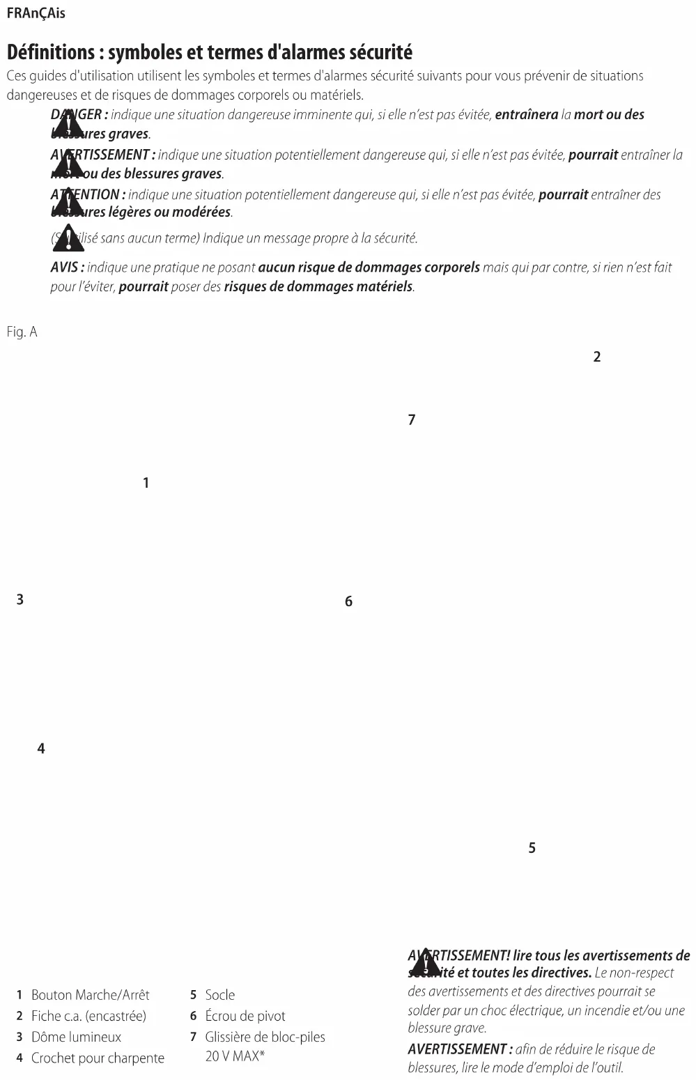 AVERTISSEMENT! lire tous les avertissements de sécurité et toutes les directives. Le non-respect des avertissements et des directives pourrait se solder par un choc électrique, un incendie et/ou une blessuregrave.