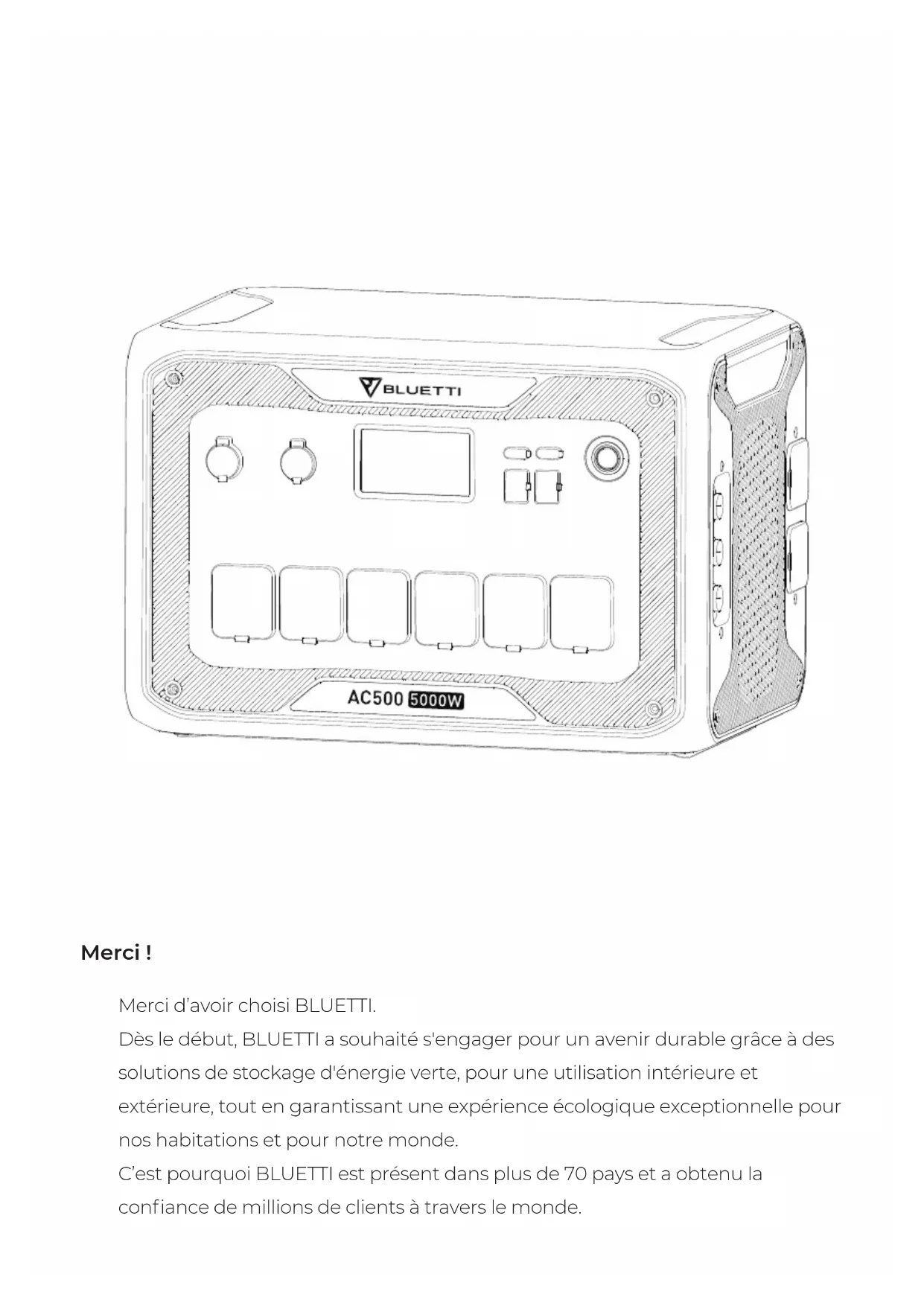 BLUETTIAC500 Manuel d’utilisationMerci! Merci d’avoir choisi BLUETTI. Dès le début, BLUETTI a souhaité s'engager pour un avenir durable grâce à des solutions de stockage d'énergie verte, pour une utilisation intérieure et extérieure, tout en garantissant une expérience écologique exceptionnelle pour nos habitations et pour notre monde. C’est pourquoi BLUETTI est présent dans plus de 70pays et a obtenu la confiance de millions de clients à travers le monde.Contenu Français Avant de commencer Consignes de sécurité Sécurité générale Entretien Manipulation et stockage Contenu Emballage standard Présentation du produit Schéma Spécifications Fonctionnement Mise sous tension et hors tension Écran LCD Charge Décharge Augmentation de la capacité ASI Application BLUETTI Mode Augmentation de la puissance Annexe FAQ (Foire Aux Questions) Assistance technique Deutsch 1-18