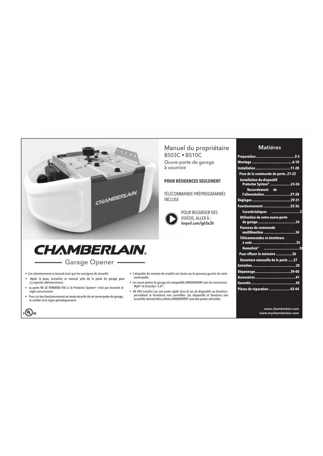 The Chamberlain Group Inc. (« le Vendeur ») garantit à l’acheteur au détail initial de ce produit pour la résidence dans laquelle ce produit est originalement installé, que ce dernier est exempt de tout défaut matériel ou de fabrication pour une période de temps précisée ci-dessous (la « Période de garantie »). La période de garantie commence à la date d’achat.PÉRIODE DE GARANTIEPièces Moteur Accessoires Courroie1 an 10 ans 1 an 5 ans Le bon fonctionnement de ce produit dépend de la conformité de l’utilisateur aux instructions relatives à l’installation, au fonctionnement, à l’entretien et aux tests. Tout défaut de se conformer strictement à ces instructions annulera la présente garantie limitée dans son intégralité. Si, pendant la période de garantie limitée, ce produit semble présenter un défaut couvert par cette garantie limitée, prière d’appeler sans frais au 1-800-528-9131 avant de désassembler ce produit. Des instructions de démontage et d’expédition seront fournies lors de votre appel. Le produit ou la pièce doit ensuite être envoyé à notre centre de réparation sous garantie, conformément aux instructions reçues, frais d’affranchissement et d’assurance prépayés. Une brève description du problème et une preuve d’achat datée devront accompagner tout produit retourné pour une réparation sous garantie. Les produits retournés au vendeur pour une réparation couverte sous garantie qui, après réception par le vendeur, sont confi rmés comme étant défectueux et couverts par la présente garantie limitée, seront réparés ou remplacés (à la discrétion du Vendeur) sans frais et retournés port payé. Les pièces défectueuses seront réparées ou remplacées par des pièces neuves ou réusinées, à la seule discrétion du Vendeur. [Les frais engagés pour le retrait et/ou la réinstallation du produit ou de tout composant incombent à l’acheteur]. TOUTE GARANTIE IMPLICITE POUR CE PRODUIT, Y COMPRIS, MAIS DE FAÇON NON LIMITATIVE, TOUTE GARANTIE IMPLICITE DE QUALITÉ MARCHANDE ET D’ADÉQUATION À UN USAGE PARTICULIER, SE LIMITE À LA DURÉE DE LA PÉRIODE DE GARANTIE LIMITÉE APPLICABLE STIPULÉE CI-DESSUS POUR LES COMPOSANTS CONCERNÉS; AUCUNE GARANTIE IMPLICITE N’EXISTERA OU NE S’APPLIQUERA APRÈS UNE TELLE PÉRIODE. Certains États et provinces ne permettent pas les limitations de la durée des garanties implicites, auquel cas la limitation précitée pourrait ne pas s’appliquer à l’Acheteur. LA PRÉSENTE GARANTIE LIMITÉE NE COUVRE PAS LES DOMMAGES QUI NE SONT PAS DUS À UN DÉFAUT, CEUX CAUSÉS PAR UNE MAUVAISE INSTALLATION, UNE OPÉRATION OU UN ENTRETIEN INADÉQUATS (INCLUANT, NOTAMMENT, LES AVARIES DUES À UN MAUVAIS TRAITEMENT, UN USAGE INAPPROPRIÉ, L’ABSENCE D’ENTRETIEN RAISONNABLE ET NÉCESSAIRE, LES RÉPARATIONS NON AUTORISÉES OU TOUTE MODIFICATION À CE PRODUIT), LES FRAIS DE MAIN-D’ŒUVRE POUR LA RÉINSTALLATION D’UNE UNITÉ RÉPARÉE OU REMPLACÉE OU LE REMPLACEMENT DES CONSOMMABLES (P. EX. LES PILES D’ÉMETTEURS À TÉLÉCOMMANDE ET AMPOULES DE LAMPE) OU LES UNITÉS INSTALLÉES À USAGE NON RÉSIDENTIEL. LA PRÉSENTE GARANTIE LIMITÉE NE COUVRE PAS LES PROBLÈMES RELATIFS OU CONNEXES À LA PORTE DU GARAGE OU À LA QUINCAILLERIE DE LA PORTE DU GARAGE, NOTAMMENT LES RESSORTS DE LA PORTE, LES GALETS DE PORTE, L’ALIGNEMENT DE LA PORTE OU LES CHARNIÈRES. LA PRÉSENTE GARANTIE LIMITÉE NE COUVRE PAS NON PLUS LES PROBLÈMES CAUSÉS PAR LES INTERFÉRENCES. LE VENDEUR NE SERA EN AUCUN CAS TENU RESPONSABLE DES DOMMAGES-INTÉRÊTS PARTICULIERS OU INDIRECTS RÉSULTANT DE L’UTILISATION OU DE L’INAPTITUDE À UTILISER CE PRODUIT CORRECTEMENT. EN AUCUN CAS, LA RESPONSABILITÉ DU VENDEUR POUR BRIS DE GARANTIE, RUPTURE DE CONTRAT, NÉGLIGENCE OU RESPONSABILITÉ STRICTE N’EXCÉDERA LE COÛT DU PRODUIT COUVERT AUX PRÉSENTES. NUL N’EST AUTORISÉ À ASSUMER POUR NOUS D’AUTRES RESPONSABILITÉS RELATIVEMENT À LA VENTE DE CE PRODUIT. Certains États et provinces n’acceptant pas l’exclusion ou les restrictions relatives aux dommages spéciaux ou indirects, les restrictions ou exclusions fi gurant dans la présente garantie pourraient ne pas s’appliquer à l’Acheteur. Certains droits légaux particuliers sont conférés à l’Acheteur en vertu de cette garantie et celui-ci pourrait avoir d’autres droits qui varient selon l’État ou la province dans lequel ou laquelle réside l’Acheteur. Coordonnées Pour des renseignements sur l’installation et l’entretien : www.chamberlain.com 1-800-528-9131 Avant d’appeler, veuillez vous assurer de disposer du numéro de modèle de l’ouvre-porte de garage. En cas d’appel au sujet d’un dépannage, il est recommandé d’avoir accès à votre ouvre-porte de garage tout en appelant. Pour commander une pièce de réparation, prière d’avoir les renseignements suivants : numéro de pièce, nom de la pièce et numéro de modèle.43