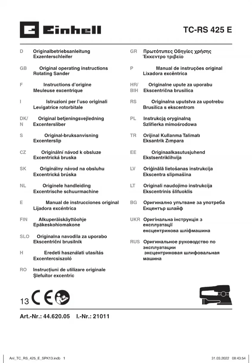 l’aff ectation La machine convient au ponçage du bois, fer, plastique et matériaux semblables en utilisant le papier abrasif approprié. La machine ne convient pas au polissage humide. La machine doit exclusivement être employée conformément à son aff ectation. Chaque uti- Anl_TC_RS_425_E_SPK13.indb 19Anl_TC_RS_425_E_SPK13.indb 19 31.03.2022 08:45:4831.03.2022 08:45:48F