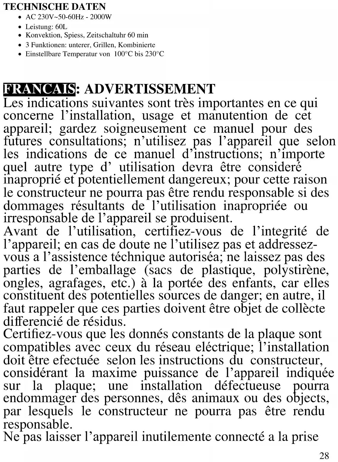 Avec le selécteur de fonctions (3) c’est possible de seléctioner seulement la résistence inférieure, la supérieure ou toutes les deuxs. Position 1 (Grillés): Active la résistence supérieure (cuisson à GRILL) e la brochette Position 2: Active la résistence inférieure Position 3 (rôtis): Active la résistence supérieure et la inférieure. Position 4 (Grillés): Active la résistence supérieure (cuisson à GRILL) e la ventilation Position 5: Active la résistence inférieure e la ventilation Position 6: Active la résistence supérieure et la inférieure, la brovchette e la ventilation. Le selécteur de température (5) permet d’établir des températures entre les 100º e les 230º C. Le temporisateur (2) permet de selectionner des temps entre 0 e 60 m. PRÈ-CHAUFFAGE Eféctuer le pré-chauffage sans avoir des aliments au four - Régler le temporisateur (2) pour 15 minutes. Régler la température desirée (5). - Régler le selécteur de fonctions a la position desirée (3) - Quand le temporisateur emet le signal acoustique, le pré-chauffage sera termine. CUISINIER - Mettez les aliments sur le récipient ou sur le plateau, selectionez la température (5), le temporisateur (2) et la fonction (3) et placez la grille du four à l’hauteur adequée. - Mettez toujours le plateau sous la grille pour éviter que la graisse puisse tomber sur l’élément de chauffage inférieur. - La lumière de fonctionnement (4) s’allumera, indiquant que l’appareil est en train d’être utilisé. - Vérifiez périodiquement l’état des aliments alors qu’ils sont confectionnés. S’il devient nécéssaire ouvrir la porte, soyez bref, de façon a ne pas baisser la température de trop. - À la fin do proccés de cuisson, la lumière s’éteindra et le temporisateur emettra des beeps. Si la cuisson n’est pas terminé reglé le temporisateur. Enlevez le plateau e la grille toujours avec sa poignée (11). Mettez le sélecteur de température au minimum (5). UTILIZATION DE LA BROCHETTE (17) - Monter la brochette (C; D) et fixer l’écrou à la cheville (B). - Insérer la pointe de la brochette dans le poulet et tirer-le vers le centre. - Insérer la pointe adequée dans le trou du côté droite de la cavité. - Insérer l’autre pointe de la brochette dans la goutière présente du côté gauche de la cavité.33 - Vérifier si la brochette a été bien mise en place. À ce point là fermer la porte et commencer la cuisson comme expliqué au paragraphe précédent. L’utilisation de la brochette doit être définie au sélecteur de fonctions (3) en choisissant la position 1 e 6. Attention: Jamais prendre la brochette avec la main. Utiliser la poignée adequée (13). NETTOYAGE Déconnectez la fiche du secteur eléctrique et laissez refroidir avant de commencer n’importe quel procédure de nettoyage. - Ne pas placer le four sous l’eau. Evitez dez écabloussures d’eau ou de n’importe quel autre liquide sur l’appareil. Le nettoyage régulier de la cavité interne de l’appareil assure une meilleur performance, et bien aussi une vie plus longue, en évitant aussi des odeurs désagréables. Utilisez un chiffon souple et des produits non abrasifs pour nettoyer la cavité intérieure. - Les accéssoires peuvent être lavés comme n’importe quel autre vaisselle. - Ne pas utiliser des éponges métalliques ou des produits abrasifs pour nettoyer l’extérieur de l’appareil puisque ça pourrait endommager sa peinture. - Ne laissez pas tomber des liquides ou detergents sur les orifíces de ventilation. Des miettes, de la graisse, huiles et résidus tombent sur le fond de la cavité. Pour un nettoyage plus facil enlevez le plateau inférieur et lavez séparément.