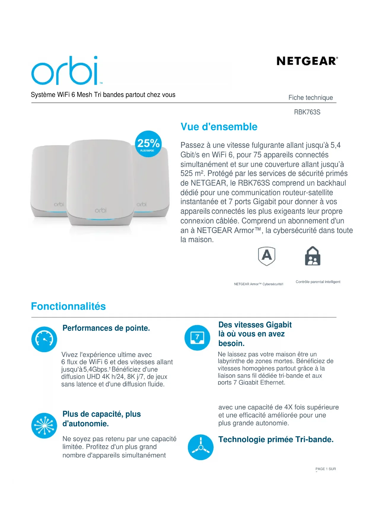 Système WiFi 6 Mesh Tri bandes partout chez vous Fiche technique RBK763S PAGE 1 SUR 5