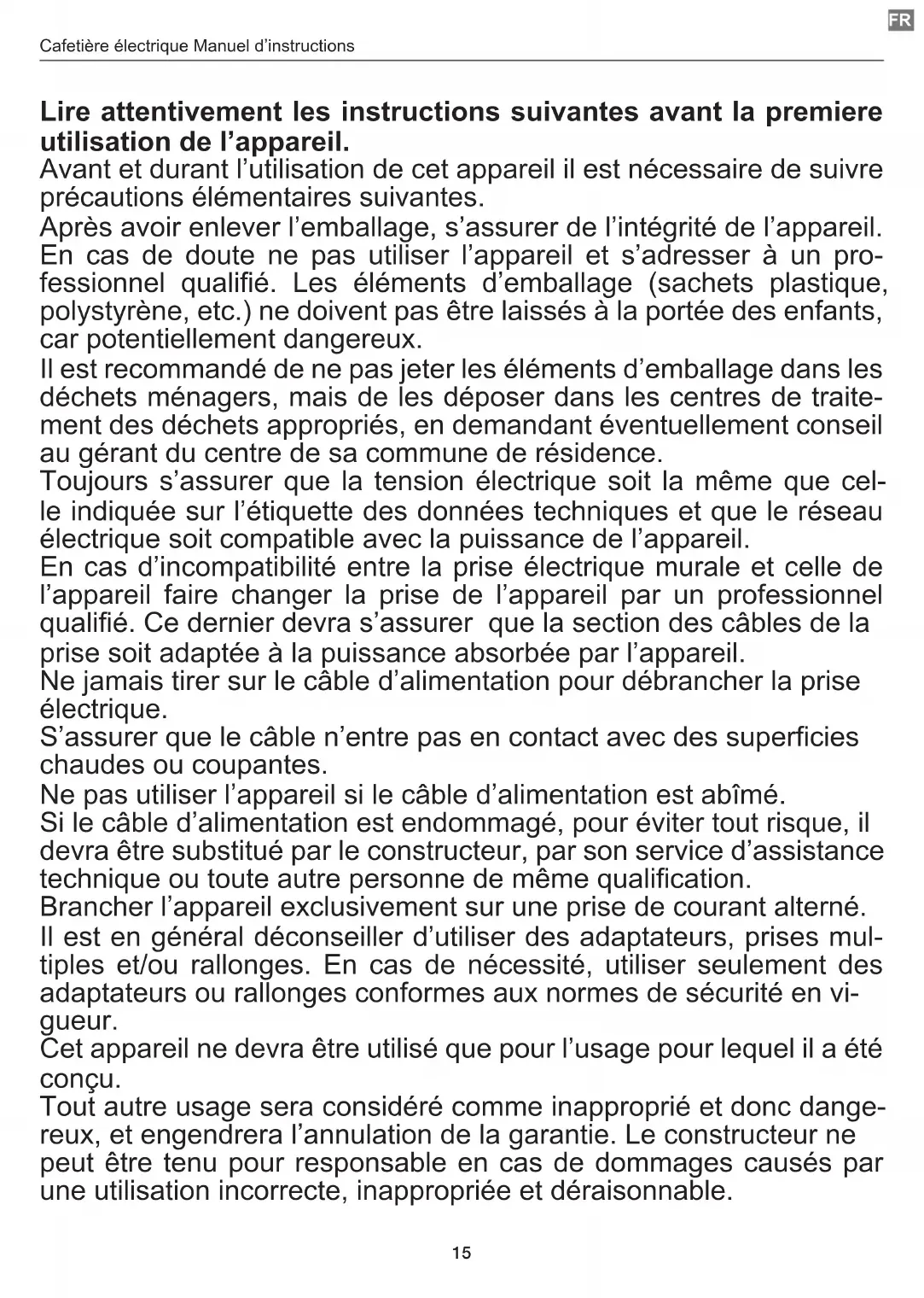 Lire attentivement les instructions suivantes avant la premiere utilisation de l’appareil. Avant et durant l’utilisation de cet appareil il est nécessaire de suivre précautions élémentaires suivantes. Après avoir enlever l’emballage, s’assurer de l’intégrité de l’appareil. En cas de doute ne pas utiliser l’appareil et s’adresser à un pro- fessionnel qualié. Les éléments d’emballage (sachets plastique, polystyrène, etc.) ne doivent pas être laissés à la portée des enfants, car potentiellement dangereux. Il est recommandé de ne pas jeter les éléments d’emballage dans les déchets ménagers, mais de les déposer dans les centres de traite- ment des déchets appropriés, en demandant éventuellement conseil au gérant du centre de sa commune de résidence. Toujours s’assurer que la tension électrique soit la même que cel- le indiquée sur l’étiquette des données techniques et que le réseau électrique soit compatible avec la puissance de l’appareil. En cas d’incompatibilité entre la prise électrique murale et celle de l’appareil faire changer la prise de l’appareil par un professionnel qualié. Ce dernier devra s’assurer que la section des câbles de la prise soit adaptée à la puissance absorbée par l’appareil. Ne jamais tirer sur le câble d’alimentation pour débrancher la prise électrique. S’assurer que le câble n’entre pas en contact avec des supercies chaudes ou coupantes. Ne pas utiliser l’appareil si le câble d’alimentation est abîmé. Si le câble d’alimentation est endommagé, pour éviter tout risque, il devra être substitué par le constructeur, par son service d’assistance technique ou toute autre personne de même qualication. Brancher l’appareil exclusivement sur une prise de courant alterné. Il est en général déconseiller d’utiliser des adaptateurs, prises mul- tiples et/ou rallonges. En cas de nécessité, utiliser seulement des adaptateurs ou rallonges conformes aux normes de sécurité en vi- gueur. Cet appareil ne devra être utilisé que pour l’usage pour lequel il a été conçu. Tout autre usage sera considéré comme inapproprié et donc dange- reux, et engendrera l’annulation de la garantie. Le constructeur ne peut être tenu pour responsable en cas de dommages causés par une utilisation incorrecte, inappropriée et déraisonnable.16 Cafetière électrique Manuel d’instructions Pour éviter tout risque d’échauffement il est recommandé de dérouler entièrement le câble d’alimentation et de débrancher l’appareil de la prise de courant en cas d’inutilisation. Avant d’effectuer toute opération de nettoyage ou entretien, débran- cher l’appareil de la prise de courant électrique. Ne jamais immerger l’appareil dans l’eau ou d’autres liquides. Ne pas toucher l’appareil avec les mains et pieds mouillés ou humi- des. Ne pas utiliser l’appareil si vous êtes pieds nus. Ne pas laisser l’appareil exposé aux agents atmosphériques comme la pluie, le soleil … Ne pas laisser l’appareil près d’une source de chaleur (ex. Radiateur) Ne pas laisser les enfants, les personnes avec des capacités physi- ques, sensorielles ou mentales réduites, ou manquant d’expérience ou de connaissance technique, utiliser cet appareil sans surveillance S’assurer que les enfants ne jouent pas avec cet appareil. Dès lors que l’appareil doit être détruit, il est recom- mandé de couper le câble d’alimentation, et de reti- rer toutes les parties susceptibles de présenter un quelconque danger, en particulier pour les enfants qui pourraient utiliser cet appareil comme un jeu. Avertissements Avertissements d’utilisation Cette machine a été construite pour “faire du café”. Ne jamais utiliser d’autres extraits, de la poudre de cacao, de la camomille, des infusions ou des substances solubles : ceux-ci peuvent boucher les trous du ltre. Pendant le nettoyage, ne jamais plonger la base et la chaudière dans l’eau : il s’agit d’un appareil électrique. Veiller à ne pas vous brûler avec des jets d’eau ou de vapeur ou en cas d’utilisation incorrecte de l’appareil. Lorsque vous utilisez l’appareil, ne touchez pas les surfaces chaudes. Utilisez les boutons ou les poignées. Remplir la chaudière avec de l’eau avant de mettre la cafetière sur les structures de soutien.ES