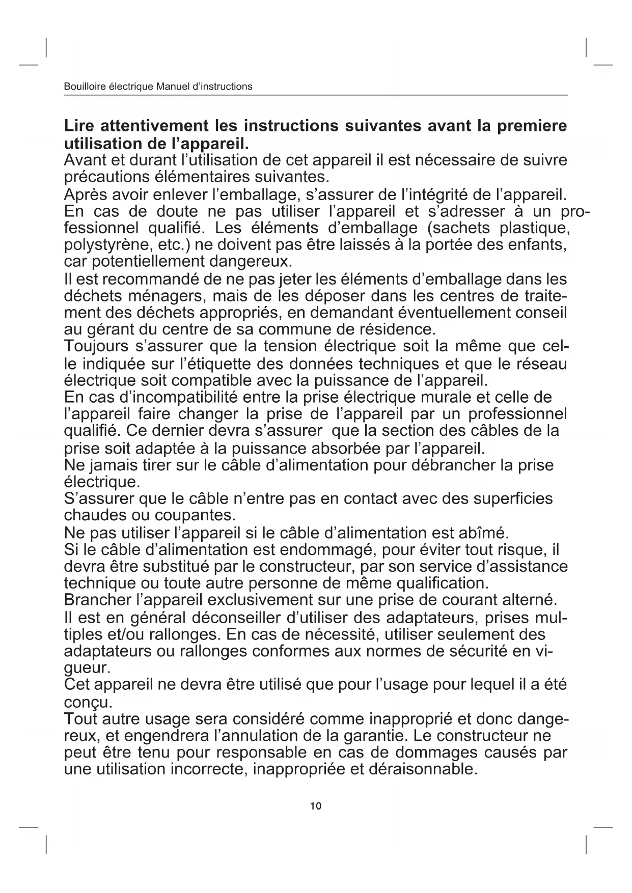 The European directive 2011/65/EU on Waste Electrical and Electronic Equipment (WEEE), requires that old household electrical appliances must not be disposed of in the normal unsorted municipal waste stream. Old appliances must be collected separately in order to optimize the recovery and recycling of the materials they contain, and reduce the impact on human health and the environment. The crossed out “wheeled bin” symbol on the product reminds you of your obligation, that when you dispose of the appliance, it must be separately collected. GUARANTEE CERTIFICATE This appliance has been checked in the factory. From the date of original purchase a 24 month guarantee ap- plies to material and production defects. The purchase receipt and the guarantee certicate must be submitted together in case of claim to guarantee. The guarantee is valid only with a guaranty certicate and proof of purchase (scal receipt) indicating the date of purchase and the model of the appliance For any technical assistance, please contact directly the seller or our head ofce in order to preserve the applian- ce’s efciency and NOT TO void the guarantee. Any intervention on this appliance by non-authorized persons will automatically void the guarantee. GUARANTEE CONDITIONS If the appliance shows defects as a result of faulty material and/or production during the period of guarantee, we guarantee repair free of charge on condition that: - The appliance has been used properly and for the purpose for which it has been intended. - The appliance has not been tampered with, otherwise it is not maintainable. - The purchase receipt shall be presented. - The appliance showing a fair wear and tear shall not be covered by this guarantee. Therefore, any part that could be accidentally broken or having visible signs of use in consumable products (such as lamps, batteries, heating elements…) the aesthetic parts are excluded from the guarantee, and any defect whatsoever resulting from non-respect of the rules for use, negligence in usage and/or maintenance of the appliance, carelessness, wrong or improper installation, damage during transport and any other damage not attributable the supplier. For every defect that could not be repaired within the guarantee period, the appliance will be replaced free of charge. In any case, if the part to be replaced for defect, breakage or malfunction is an accessory and/or a detachable part of the product, Beper reserves the right to replace only the very part in question and not the entire product Contact your distributor in your country or after sales department Beper. E-mail assistenza@beper.com which will forward your enquiries to your distributor.10 Bouilloire électrique Manuel d’instructions Lire attentivement les instructions suivantes avant la premiere utilisation de l’appareil. Avant et durant l’utilisation de cet appareil il est nécessaire de suivre précautions élémentaires suivantes. Après avoir enlever l’emballage, s’assurer de l’intégrité de l’appareil. En cas de doute ne pas utiliser l’appareil et s’adresser à un pro- fessionnel qualié. Les éléments d’emballage (sachets plastique, polystyrène, etc.) ne doivent pas être laissés à la portée des enfants, car potentiellement dangereux. Il est recommandé de ne pas jeter les éléments d’emballage dans les déchets ménagers, mais de les déposer dans les centres de traite- ment des déchets appropriés, en demandant éventuellement conseil au gérant du centre de sa commune de résidence. Toujours s’assurer que la tension électrique soit la même que cel- le indiquée sur l’étiquette des données techniques et que le réseau électrique soit compatible avec la puissance de l’appareil. En cas d’incompatibilité entre la prise électrique murale et celle de l’appareil faire changer la prise de l’appareil par un professionnel qualié. Ce dernier devra s’assurer que la section des câbles de la prise soit adaptée à la puissance absorbée par l’appareil. Ne jamais tirer sur le câble d’alimentation pour débrancher la prise électrique. S’assurer que le câble n’entre pas en contact avec des supercies chaudes ou coupantes. Ne pas utiliser l’appareil si le câble d’alimentation est abîmé. Si le câble d’alimentation est endommagé, pour éviter tout risque, il devra être substitué par le constructeur, par son service d’assistance technique ou toute autre personne de même qualication. Brancher l’appareil exclusivement sur une prise de courant alterné. Il est en général déconseiller d’utiliser des adaptateurs, prises mul- tiples et/ou rallonges. En cas de nécessité, utiliser seulement des adaptateurs ou rallonges conformes aux normes de sécurité en vi- gueur. Cet appareil ne devra être utilisé que pour l’usage pour lequel il a été conçu. Tout autre usage sera considéré comme inapproprié et donc dange- reux, et engendrera l’annulation de la garantie. Le constructeur ne peut être tenu pour responsable en cas de dommages causés par une utilisation incorrecte, inappropriée et déraisonnable.11 ESESESFR Bouilloire électrique Manuel d’instructions Pour éviter tout risque d’échauffement il est recommandé de dérouler entièrement le câble d’alimentation et de débrancher l’appareil de la prise de courant en cas d’inutilisation. Avant d’effectuer toute opération de nettoyage ou entretien, débran- cher l’appareil de la prise de courant électrique. Ne jamais immerger l’appareil dans l’eau ou d’autres liquides. Ne pas toucher l’appareil avec les mains et pieds mouillés ou humi- des. Ne pas utiliser l’appareil si vous êtes pieds nus. Ne pas laisser l’appareil exposé aux agents atmosphériques comme la pluie, le soleil … Ne pas laisser l’appareil près d’une source de chaleur (ex. Radiateur) Ne pas laisser les enfants, les personnes avec des capacités physi- ques, sensorielles ou mentales réduites, ou ma