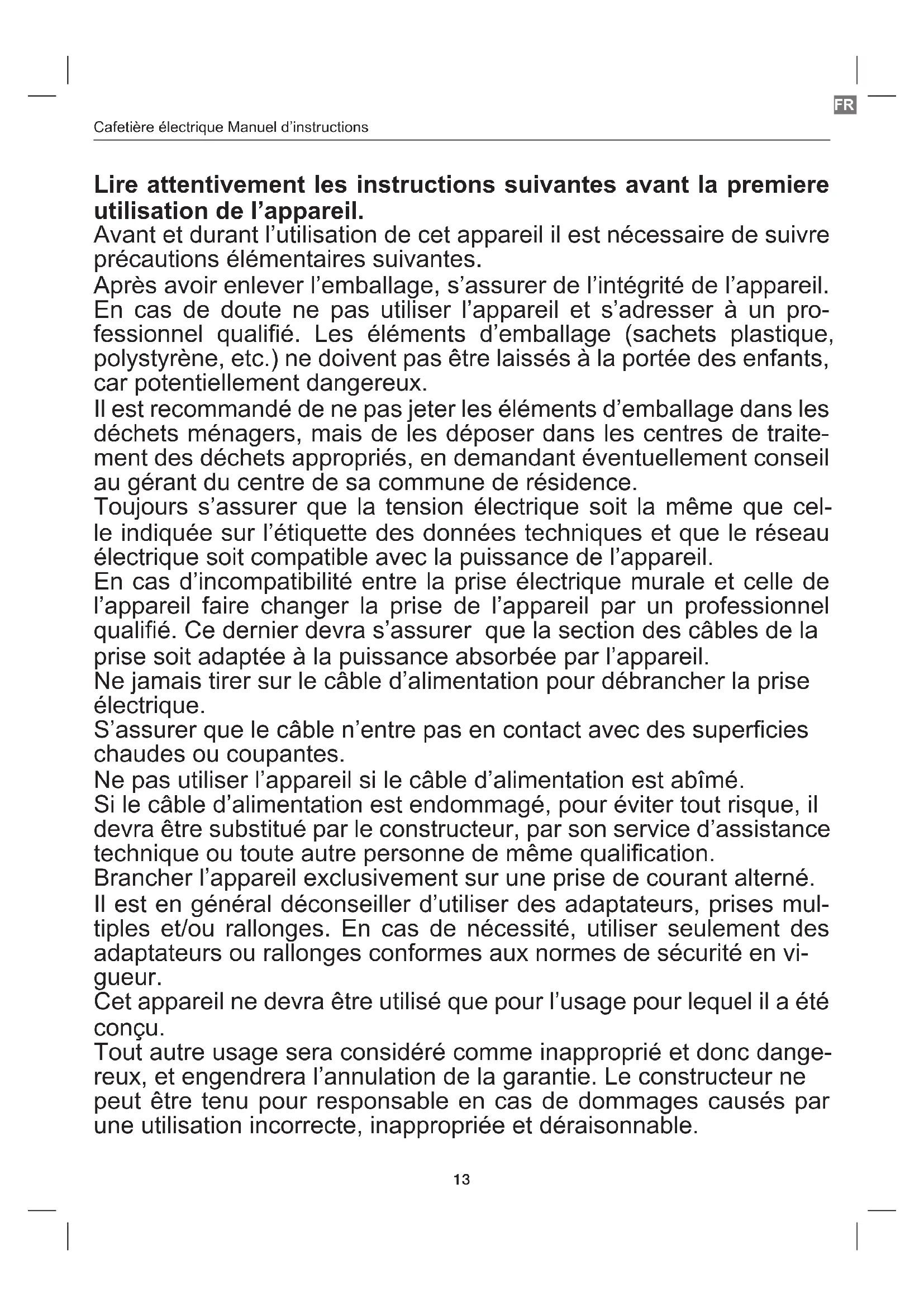 Lire attentivement les instructions suivantes avant la premiere utilisation de l’appareil. Avant et durant l’utilisation de cet appareil il est nécessaire de suivre précautions élémentaires suivantes. Après avoir enlever l’emballage, s’assurer de l’intégrité de l’appareil. En cas de doute ne pas utiliser l’appareil et s’adresser à un pro- fessionnel qualié. Les éléments d’emballage (sachets plastique, polystyrène, etc.) ne doivent pas être laissés à la portée des enfants, car potentiellement dangereux. Il est recommandé de ne pas jeter les éléments d’emballage dans les déchets ménagers, mais de les déposer dans les centres de traite- ment des déchets appropriés, en demandant éventuellement conseil au gérant du centre de sa commune de résidence. Toujours s’assurer que la tension électrique soit la même que cel- le indiquée sur l’étiquette des données techniques et que le réseau électrique soit compatible avec la puissance de l’appareil. En cas d’incompatibilité entre la prise électrique murale et celle de l’appareil faire changer la prise de l’appareil par un professionnel qualié. Ce dernier devra s’assurer que la section des câbles de la prise soit adaptée à la puissance absorbée par l’appareil. Ne jamais tirer sur le câble d’alimentation pour débrancher la prise électrique. S’assurer que le câble n’entre pas en contact avec des supercies chaudes ou coupantes. Ne pas utiliser l’appareil si le câble d’alimentation est abîmé. Si le câble d’alimentation est endommagé, pour éviter tout risque, il devra être substitué par le constructeur, par son service d’assistance technique ou toute autre personne de même qualication. Brancher l’appareil exclusivement sur une prise de courant alterné. Il est en général déconseiller d’utiliser des adaptateurs, prises mul- tiples et/ou rallonges. En cas de nécessité, utiliser seulement des adaptateurs ou rallonges conformes aux normes de sécurité en vi- gueur. Cet appareil ne devra être utilisé que pour l’usage pour lequel il a été conçu. Tout autre usage sera considéré comme inapproprié et donc dange- reux, et engendrera l’annulation de la garantie. Le constructeur ne peut être tenu pour responsable en cas de dommages causés par une utilisation incorrecte, inappropriée et déraisonnable.14 Cafetière électrique Manuel d’instructions Pour éviter tout risque d’échauffement il est recommandé de dérouler entièrement le câble d’alimentation et de débrancher l’appareil de la prise de courant en cas d’inutilisation. Avant d’effectuer toute opération de nettoyage ou entretien, débran- cher l’appareil de la prise de courant électrique. Ne jamais immerger l’appareil dans l’eau ou d’autres liquides. Ne pas toucher l’appareil avec les mains et pieds mouillés ou humi- des. Ne pas utiliser l’appareil si vous êtes pieds nus. Ne pas laisser l’appareil exposé aux agents atmosphériques comme la pluie, le soleil … Ne pas laisser l’appareil près d’une source de chaleur (ex. Radiateur) Ne pas laisser les enfants, les personnes avec des capacités physi- ques, sensorielles ou mentales réduites, ou manquant d’expérience ou de connaissance technique, utiliser cet appareil sans surveillance S’assurer que les enfants ne jouent pas avec cet appareil. Dès lors que l’appareil doit être détruit, il est recom- mandé de couper le câble d’alimentation, et de reti- rer toutes les parties susceptibles de présenter un quelconque danger, en particulier pour les enfants qui pourraient utiliser cet appareil comme un jeu. Avertissements Avertissements d’utilisation Cette machine a été construite pour “faire du café”. Ne jamais utiliser d’autres extraits, de la poudre de cacao, de la camomille, des infusions ou des substances solubles : ceux-ci peuvent boucher les trous du ltre. Pendant le nettoyage, ne jamais plonger la base et la chaudière dans l’eau : il s’agit d’un appareil électrique. Veiller à ne pas vous brûler avec des jets d’eau ou de vapeur ou en cas d’utilisation incorrecte de l’appareil. Lorsque vous utilisez l’appareil, ne touchez pas les surfaces chaudes. Utilisez les boutons ou les poignées. Remplir la chaudière avec de l’eau avant de mettre la cafetière sur les structures de soutien.ES