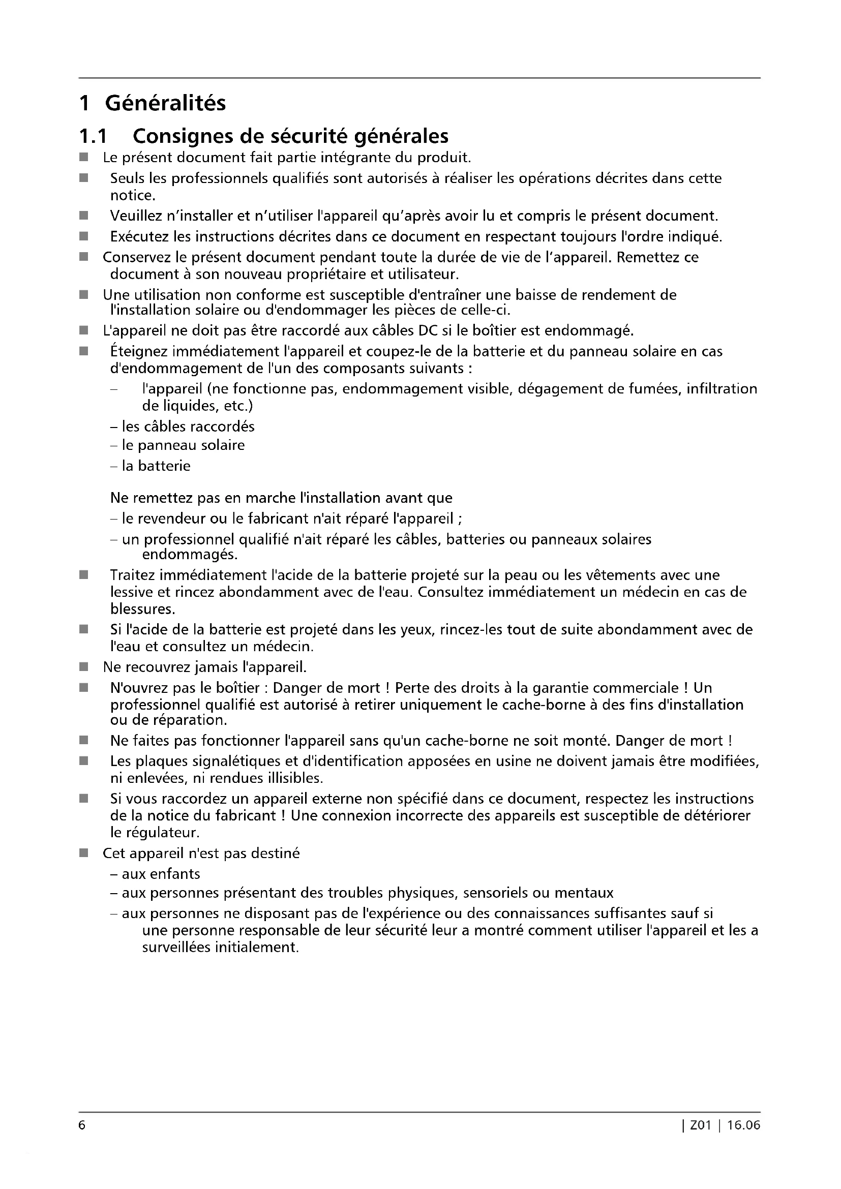 | Z01 | 16.06 7Dans le cas d'une utilisation de systèmes lithium-ion, un système de contrôles de batteries externe (BMS) doit assurer les fonctions de protection et de sécurité nécessaires à l'exploitation (par exemple la surveillance de la température, la coupure de sécurité et la compensation de tensions d'élément). Ces fonctions ne sont pas fournies par les modèles MPPT 6000-M/S. REMARQUE ! MPPT 6000-M : dans le cas d'un groupement de régulateurs MPPT 6000-M et MPPT 6000-S, la charge d'accumulateurs lithium-ion et nickel-cadmium n'est possible que par la commande maître/esclave de l'appareil MPPT 6000-M. La charge d'accumulateurs lithium-ion et nickel- cadmium par le régulateur MPPT 6000-S est désactivée dès que l'appareil MPPT 6000-M n'est plus actif dans le groupement. Rappel : n Le régulateur ne doit jamais être raccordé au réseau électrique public. n Seuls les panneaux solaires peuvent être raccordés à leurs branchements. n Tensions de système éventuelles pour les régulateurs MPPT 6000-M/-S (tensions de batterie nominales) : 12 V, 24 V, 36 V, 48 V, 60 V ; (12 V, 24 V et 48 V : détection automatique ; 36 V, 60 V : réglage manuel via le menu expert). n Le régulateur effectue notamment les opérations suivantes :