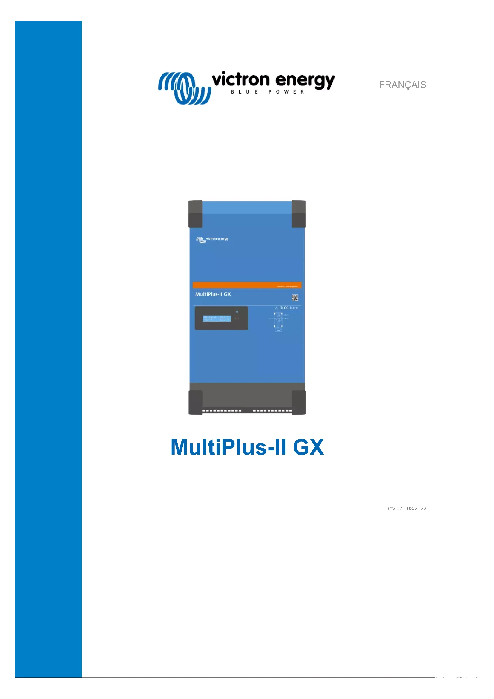 - MultiPlus-II GX 48/5000/70-50 MultiPlus-II GX Page 1 MultiPlus-II GX Manuel du produit2. Consignes de sécurité Veuillez lire la documentation fournie avec cet appareil avant de l’utiliser, afin de vous familiariser avec les symboles et les consignes de sécurité. Cet appareil a été conçu et testé conformément aux normes internationales. Le produit ne doit être utilisé que pour l’usage désigné.