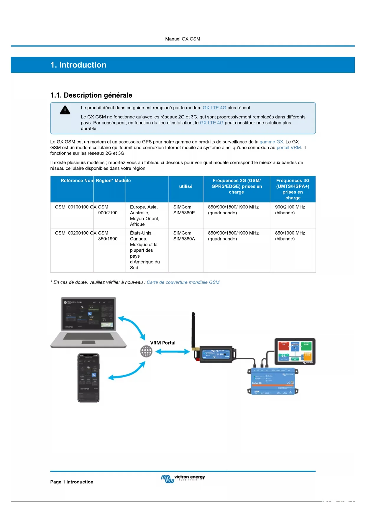 - En cas de doute, veuillez vérifier à nouveau : Carte de couverture mondiale GSM VRM Portal Manuel GX GSM Page 1 Introduction2. Fonctions 2.1. Récepteur GPS intégré Le GX GSM inclut un récepteur GPS. Lorsque l’antenne GPS active en option est installée, le système peut être suivi ainsi que géorepéré sur le portail VRM. La référence de l’accessoire requis est GSM900200100 - Antenne GPS active pour GX GSM. 2.2. Compatibilité GX Le GX GSM peut être utilisé avec n’importe quel dispositif GX et nécessite l’installation de Venus OS v2.22 ou d’une version ultérieure sur le dispositif GX. 2.3. Carte SIM Il nécessite une carte SIM au format mini-SIM et se connecte au dispositif GX à l’aide d’un câble USB de 1 m inclus. 2.4. Quand utiliser un routeur mobile à la place Le GX GSM fournit une connexion Internet pour le dispositif GX uniquement. Aucune option ne permet le partage Internet avec des ordinateurs portables, des téléphones ou d’autres appareils. Pour des installations où des appareils ayant besoin d’Internet, tels qu’un yacht ou un camping-car, envisagez plutôt l’installation d’un routeur mobile. 2.5. Antennes et accessoires Une petite antenne GSM intérieure est incluse. En option, nous vendons également une antenne GSM 2G et 3G extérieure, qui permet d’augmenter la portée :