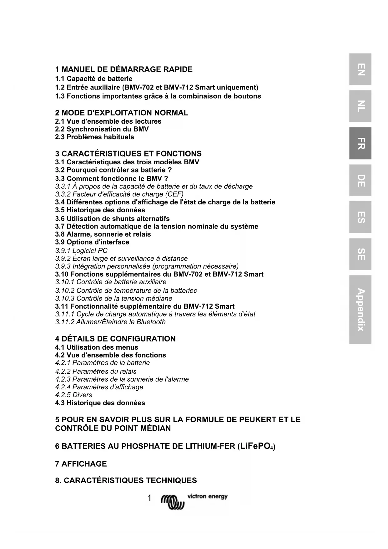 Puissance La puissance extraite de la batterie (pôle négatif) ou rentrant dans la batterie (sans pôle).9 NL FR DE ES SE IT PT EN NL FR DE ES SE Appendix Ampères-heures consommés La quantité d'Ah consommés depuis la batterie Exemple : Si un courant de 12 A est tiré de la batterie pendant une période de 3 heures, l'écran affichera une lecture de -36,0 Ah. (-12 x 3 = -36) Remarque : trois tirets « --- » s’afficheront lorsque le BMV s’allumera en état non synchronisé. Voir la section 4.2.1, paramètre 70. État de charge : Une batterie totalement pleine indique une valeur de 100,0 %. Une batterie totalement vide indique une valeur de 0,0 %. Remarque : trois tirets « --- » s’afficheront lorsque le BMV s’allumera en état non synchronisé. Voir la section 4.2.1, paramètre 70. Autonomie restante : Cette indication correspond à la durée estimée pendant laquelle la batterie peut alimenter la demande actuelle, avant de devoir être rechargée. L'autonomie restante affichée correspond au temps nécessaire pour atteindre le plancher de décharge. Voir 4.2.2, paramètre numéro 16. Remarque : trois tirets « --- » s’afficheront lorsque le BMV s’allumera en état non synchronisé. Voir la section 4.2.1, paramètre 70. Température de la batterie BMV-702 et -712 uniquement, si l'entrée auxiliaire est définie sur TEMP. La valeur peut être affichée en degrés Celsius ou en degrés Fahrenheit. Voir section 4.2.5.10 Tension de la section supérieure du banc de batteries BMV-702 et -712 uniquement, si l'entrée auxiliaire est définie sur MID. Comparez avec la tension de section inférieure pour vérifier l'équilibrage des charges de la batterie. Pour de plus amples renseignements sur le contrôle du point médian de la batterie, consultez la section 5.2. Tension de la section inférieure du banc de batteries BMV-702 et -712 uniquement, si l'entrée auxiliaire est définie sur MID. Comparez avec la tension de section supérieure pour vérifier l'équilibrage des charges de la batterie. Écart du point médian du banc de batteries BMV-702 et -712 uniquement, si l'entrée auxiliaire est définie sur MID. Écart en pourcentage de la tension médiane mesurée. Écart en volts du point médian du banc de batteries BMV-702 et -712 uniquement, si l'entrée auxiliaire est définie sur MID. Écart en volts de la tension médiane.