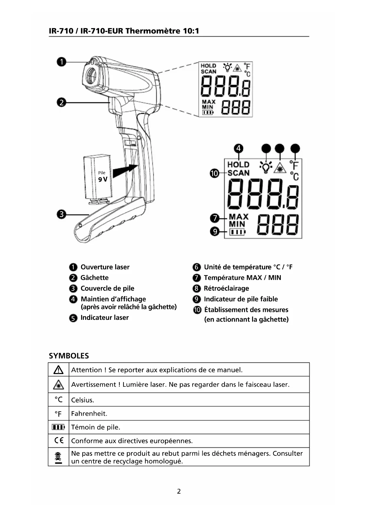 Le carton d’emballage doit inclure les éléments suivants : 1 thermomètre IR-710 / IR-710-EUR 1 pile 9 V (installée) 1 Mode d’emploi Si l’un de ces éléments est endommagé ou manquant, renvoyez le contenu complet de l’emballage au lieu d’achat pour l’échanger. FONCTIONNALITÉS Le thermomètre Amprobe IR-710 / IR-710-EUR, un thermomètre infrarouge avec un rapport de distance à taille de point focal de 10:1, offre la meilleure précision de sa classe et un temps de réponse avec une plage de mesure de températures de -18 °C à 380 °C (0 °F à 716 °F). L’IR-710 / IR-710-EUR est spécialement conçu pour les applications CVC/R, l’électricité, la maintenance industrielle, l’automobile ainsi que le contrôle de la qualité et la prévention des incendies.