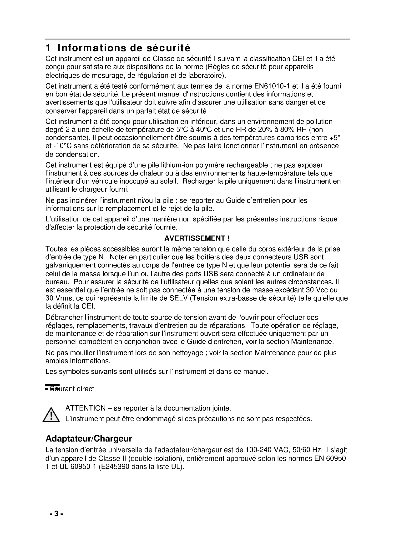 Autres informations 26- 3 - 1 Informations de sécurité Cet instrument est un appareil de Classe de sécurité I suivant la classification CEI et il a été conçu pour satisfaire aux dispositions de la norme (Règles de sécurité pour appareils électriques de mesurage, de régulation et de laboratoire). Cet instrument a été testé conformément aux termes de la norme EN61010-1 et il a été fourni en bon état de sécurité. Le présent manuel d'instructions contient des informations et avertissements que l'utilisateur doit suivre afin d'assurer une utilisation sans danger et de conserver l'appareil dans un parfait état de sécurité. Cet instrument a été conçu pour utilisation en intérieur, dans un environnement de pollution degré 2 à une échelle de température de 5°C à 40°C et une HR de 20% à 80% RH (non- condensante). Il peut occasionnellement être soumis à des températures comprises entre +5° et -10°C sans détérioration de sa sécurité. Ne pas faire fonctionner l’instrument en présence de condensation. Cet instrument est équipé d’une pile lithium-ion polymère rechargeable ; ne pas exposer l’instrument à des sources de chaleur ou à des environnements haute-température tels que l’intérieur d’un véhicule inoccupé au soleil. Recharger la pile uniquement dans l’instrument en utilisant le chargeur fourni. Ne pas incinérer l’instrument ni/ou la pile ; se reporter au Guide d’entretien pour les informations sur le remplacement et le rejet de la pile. L’utilisation de cet appareil d’une manière non spécifiée par les présentes instructions risque d'affecter la protection de sécurité fournie. AVERTISSEMENT ! Toutes les pièces accessibles auront la même tension que celle du corps extérieur de la prise d’entrée de type N. Noter en particulier que les boîtiers des deux connecteurs USB sont galvaniquement connectés au corps de l’entrée de type N et que leur potentiel sera de ce fait celui de la masse lorsque l’un ou l’autre des ports USB sera connecté à un ordinateur de bureau. Pour assurer la sécurité de l’utilisateur quelles que soient les autres circonstances, il est essentiel que l’entrée ne soit pas connectée à une tension de masse excédant 30 Vcc ou 30 Vrms, ce qui représente la limite de SELV (Tension extra-basse de sécurité) telle qu’elle que la définit la CEI. Débrancher l’instrument de toute source de tension avant de l'ouvrir pour effectuer des réglages, remplacements, travaux d'entretien ou de réparations. Toute opération de réglage, de maintenance et de réparation sur l’instrument ouvert sera effectuée uniquement par un personnel compétent en conjonction avec le Guide d’entretien, voir la section Maintenance. Ne pas mouiller l’instrument lors de son nettoyage ; voir la section Maintenance pour de plus amples informations. Les symboles suivants sont utilisés sur l’instrument et dans ce manuel. Courant direct ATTENTION – se reporter à la documentation jointe. L’instrument peut être endommagé si ces précautions ne sont pas respectées. Adaptateur/Chargeur La tension d’entrée universelle de l’adaptateur/chargeur est de 100-240 VAC, 50/60 Hz. Il s’agit d’un appareil de Classe II (double isolation), entièrement approuvé selon les normes EN 60950- 1 et UL 60950-1 (E245390 dans la liste UL).- 4 - 2 Informations générales