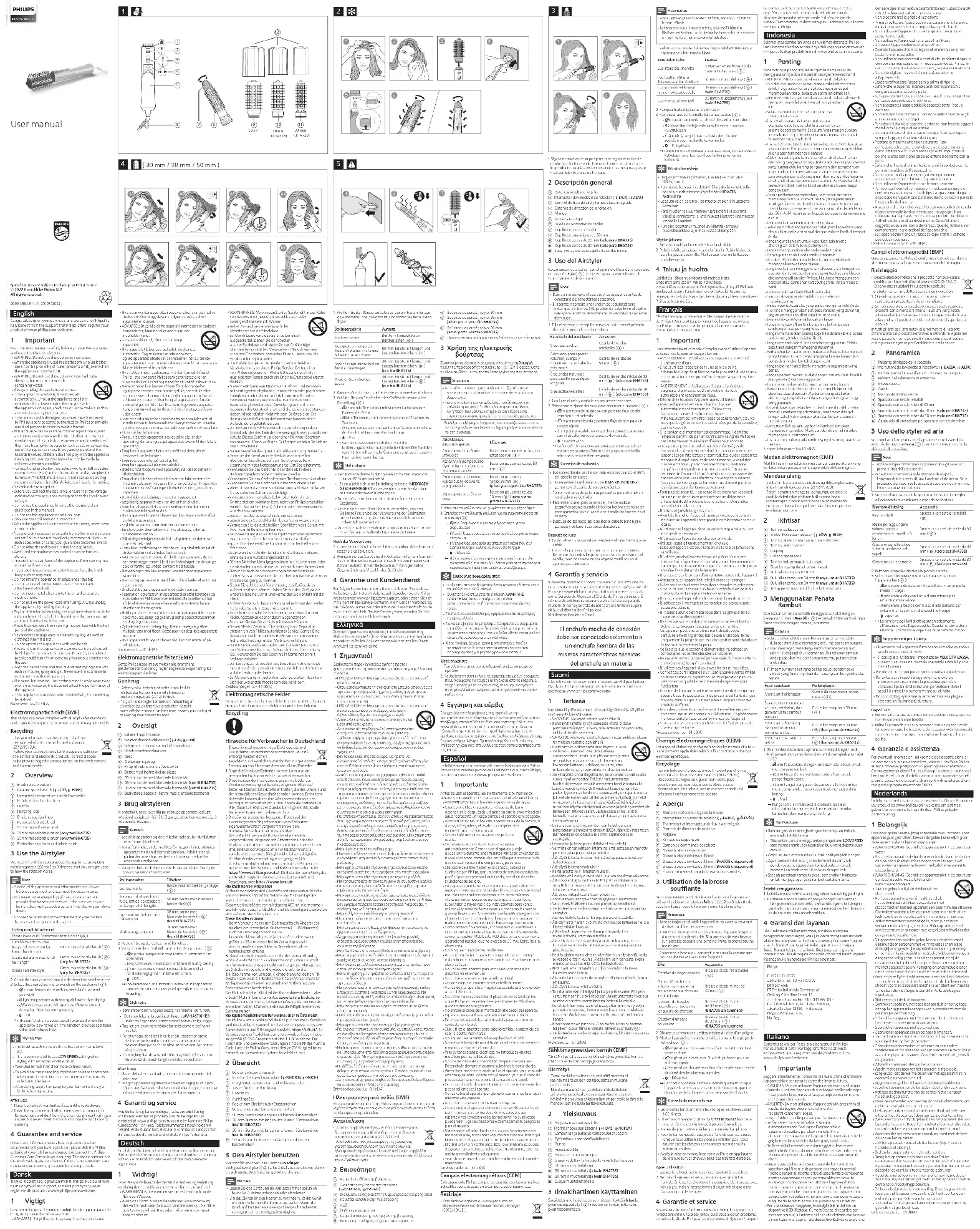 - Se recomienda utilizar el ajuste BAJA VELOCIDAD al peinar con el cepillo de cerdas retráctiles. • Tome mechones de pelo más pequeños para obtener un resultado más denido. • Para evitar que el pelo se enrede, intente realizar pequeñas pausas cuando utilice los botones de rotación para garantizar que el cabello se enrolla fácilmente en el cilindro. • Después del peinado, aplique laca al cabello para jar el peinado y obtener resultados duraderos.Después del uso: 1 Colóquelo en una supercie resistente al calor hasta que se enfríe.2 Limpie el aparato y los accesorios con un paño húmedo. Retire con los dedos los pelos y el polvo del accesorio del cepillo, pero no inserte nunca objetos metálicos en el aparato para limpiarlo. 4 Garantía y servicio Si necesita información sobre, por ejemplo, la sustitución de un accesorio o si tiene algún problema, visite la página web de Philips en www.philips.com/support o póngase en contacto con el Servicio de Atención al Cliente de Philips en su país. El número de teléfono se encuentra en el folleto de garantía mundial. Si no hay servicio de atención al cliente en su país, diríjase al distribuidor Philips local.Moldeador; Insulation Class II El enchufe macho de conexión debe ser conectado solamente a un enchufe hembra de las mismas caracteríscas técnicas del enchufe en materia Suomi Olet tehnyt erinomaisen valinnan ostaessasi Philipsin laitteen. Hyödynnä Philipsin tukipalveluita rekisteröimällä tuotteesi osoitteessa www.philips.com/welcome. 1 Tärkeää Lue tämä käyttöopas ennen laitteen käyttämistä ja säilytä se myöhempää käyttöä varten. • VAROITUS: Älä käytä laitetta veden lähellä. • Kun käytät laitetta kylpyhuoneessa, irrota pistoke pistorasiasta käytön jälkeen, sillä laitteessa on jännitettä, vaikka virta olisi katkaistu. • VAROITUS: Älä käytä laitetta kylpyammeen, suihkun, altaan tai muiden vesiastioiden lähellä. • Irrota pistoke pistorasiasta aina käytön jälkeen. • Jos laite kuumenee liikaa, virta katkeaa automaattisesti. Irrota laite pistorasiasta ja anna sen jäähtyä muutama minuutti. Ennen kuin käynnistät laitteen uudelleen, tarkasta, ettei ritilään ole kertynyt esimerkiksi nukkaa tai hiuksia. • Jos virtajohto on vahingoittunut, se on oman turvallisuutesi vuoksi hyvä vaihdattaa Philipsin valtuuttamassa huoltoliikkeessä tai muulla ammattitaitoisella korjaajalla. • Laitetta voivat käyttää yli 8-vuotiaat lapset ja henkilöt, joiden fyysinen tai henkinen toimintakyky on rajoittunut tai joilla ei ole kokemusta tai tietoa laitteen käytöstä, jos heitä on neuvottu laitteen turvallisesta käytöstä tai tarjolla on turvallisen käytön edellyttämä valvonta ja jos he ymmärtävät laitteeseen liittyvät vaarat. Lasten ei saa antaa leikkiä laitteella. Lasten ei saa antaa puhdistaa tai huoltaa laitetta ilman valvontaa. • Lisäksi suosittelemme asentamaan kylpyhuoneen pistorasiaan jäännösvirtalaitteen (RCD). Jäännösvirtalaitteen jäännösvirran on oltava alle 30mA. Lisätietoja saat asentajalta. • Ilmanotto- ja ilmanpoistoritilöitä ei saa peittää. • Varmista ennen laitteen liittämistä, että laitteeseen merkitty jännite vastaa paikallista jännitettä. • Älä käytä laitetta muuhun kuin tässä oppaassa kuvattuun tarkoitukseen. • Älä käytä laitetta tekohiuksiin. • Käytä laitetta vain ihmisten hiuksiin. • Kun laite on liitetty pistorasiaan, älä jätä sitä ilman valvontaa. • Älä koskaan käytä muita kuin Philipsin valmistamia tai suosittelemia lisävarusteita tai -osia. Jos käytät muita osia, takuu ei ole voimassa. • Älä kierrä virtajohtoa laitteen ympärille. • Anna laitteen jäähtyä ennen säilytykseen asettamista. • Varo, etteivät laitteen kuumat pinnat kosketa ihoasi. • Jos laitteella käsitellään värjättyjä hiuksia, sen pinta saattaa värjäytyä. • Älä huuhtele laitetta tai harjoja juoksevalla vedellä. • Älä käynnistä harjan pyörimistoimintoa, jos laitteeseen ei ole liitetty mitään lisäosaa. • Älä työnnä ilmanotto- tai ilmanpoistoaukkoihin metalliesineitä, ettet saa sähköiskua. • Älä vedä laitteen virtajohdosta laitteen käytön jälkeen. Irrota laitteen pistoke pistorasiasta aina pitämällä kiinni pistokkeesta. • Keskity yksinomaan laitteen käyttöön, kun käytät sitä, koska se voi olla erittäin kuuma. Pidä kiinni vain kahvasta, koska muut osat ovat kuumia. Vältä ihokosketusta. • Pidä huoli, ettei virtajohto joudu kosketuksiin laitteen kuumien osien kanssa. • Älä peitä laitetta esimerkiksi pyyhkeellä tai vaatteella, kun se on kuuma. • Älä käytä laitetta märillä käsillä. • Toimita laite vianmääritystä ja korjaamista varten Philipsin valtuuttamaan huoltoliikkeeseen. Asiantuntematon korjaus saattaa aiheuttaa vaaratilanteita laitteen käyttäjälle. • Puhdista kiharrinosa säännöllisesti, ettei niihin kerry pölyä ja muotoilutuotteita, kuten muotoiluvaahtoa, hiuslakkaa tai geeliä. Älä koskaan käytä laitetta muotoilutuotteiden kanssa. • Kiharrinosassa on pinnoite. Ajan myötä pinnoite saattaa hiljalleen kulua. Tämä ei vaikuta laitteen suorituskykyyn. • Jos laitteella käsitellään värjättyjä hiuksia, kiharrinosa saattaa värjäytyä.Melutaso: Lc = 81 dB(A) Sähkömagneettiset kentät (EMF) Tämä Philips-laite vastaa kaikkia sähkömagneettisia kenttiä (EMF) koskevia standardeja ja säännöksiä. Kierrätys - Tämä merkki tarkoittaa sitä, että tätä tuotetta ei saa hävittää tavallisen kotitalousjätteen mukana (2012/19/EU). - Noudata maasi sähkö- ja elektroniikkalaitteiden erillistä keräystä koskevia sääntöjä. Asianmukainen hävittäminen auttaa ehkäisemään ympäristölle ja ihmisille mahdollisesti koituvia haittavaikutuksia. 2 Yleiskuvaus a Harjaosan vapautuspainike b Pyörimisnopeuden säädin ( -HIDAS, -NOPEA) c Lämpötilan ja puhallusvoimakkuuden säädind Pyörimissuunnan sä