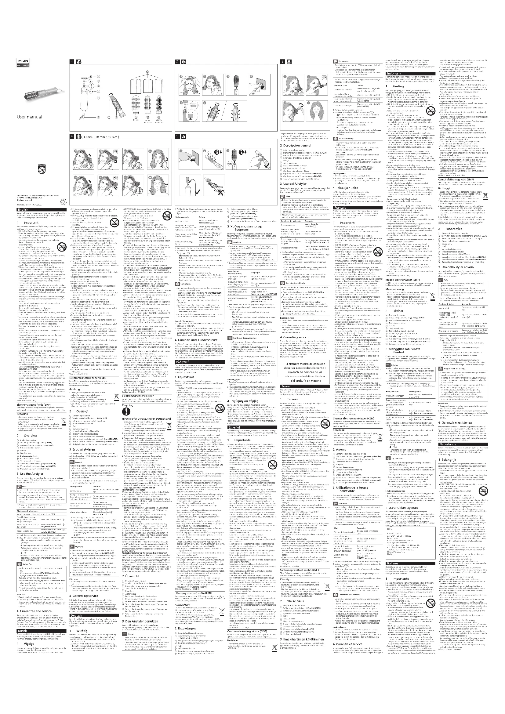 - Se recomienda utilizar el ajuste BAJA VELOCIDAD al peinar con el cepillo de cerdas retráctiles. • Tome mechones de pelo más pequeños para obtener un resultado más denido. • Para evitar que el pelo se enrede, intente realizar pequeñas pausas cuando utilice los botones de rotación para garantizar que el cabello se enrolla fácilmente en el cilindro. • Después del peinado, aplique laca al cabello para jar el peinado y obtener resultados duraderos.Después del uso: 1 Colóquelo en una supercie resistente al calor hasta que se enfríe.2 Limpie el aparato y los accesorios con un paño húmedo. Retire con los dedos los pelos y el polvo del accesorio del cepillo, pero no inserte nunca objetos metálicos en el aparato para limpiarlo. 4 Garantía y servicio Si necesita información sobre, por ejemplo, la sustitución de un accesorio o si tiene algún problema, visite la página web de Philips en www.philips.com/support o póngase en contacto con el Servicio de Atención al Cliente de Philips en su país. El número de teléfono se encuentra en el folleto de garantía mundial. Si no hay servicio de atención al cliente en su país, diríjase al distribuidor Philips local.Moldeador; Insulation Class II El enchufe macho de conexión debe ser conectado solamente a un enchufe hembra de las mismas caracteríscas técnicas del enchufe en materia Suomi Olet tehnyt erinomaisen valinnan ostaessasi Philipsin laitteen. Hyödynnä Philipsin tukipalveluita rekisteröimällä tuotteesi osoitteessa www.philips.com/welcome. 1 Tärkeää Lue tämä käyttöopas ennen laitteen käyttämistä ja säilytä se myöhempää käyttöä varten. • VAROITUS: Älä käytä laitetta veden lähellä. • Kun käytät laitetta kylpyhuoneessa, irrota pistoke pistorasiasta käytön jälkeen, sillä laitteessa on jännitettä, vaikka virta olisi katkaistu. • VAROITUS: Älä käytä laitetta kylpyammeen, suihkun, altaan tai muiden vesiastioiden lähellä. • Irrota pistoke pistorasiasta aina käytön jälkeen. • Jos laite kuumenee liikaa, virta katkeaa automaattisesti. Irrota laite pistorasiasta ja anna sen jäähtyä muutama minuutti. Ennen kuin käynnistät laitteen uudelleen, tarkasta, ettei ritilään ole kertynyt esimerkiksi nukkaa tai hiuksia. • Jos virtajohto on vahingoittunut, se on oman turvallisuutesi vuoksi hyvä vaihdattaa Philipsin valtuuttamassa huoltoliikkeessä tai muulla ammattitaitoisella korjaajalla. • Laitetta voivat käyttää yli 8-vuotiaat lapset ja henkilöt, joiden fyysinen tai henkinen toimintakyky on rajoittunut tai joilla ei ole kokemusta tai tietoa laitteen käytöstä, jos heitä on neuvottu laitteen turvallisesta käytöstä tai tarjolla on turvallisen käytön edellyttämä valvonta ja jos he ymmärtävät laitteeseen liittyvät vaarat. Lasten ei saa antaa leikkiä laitteella. Lasten ei saa antaa puhdistaa tai huoltaa laitetta ilman valvontaa. • Lisäksi suosittelemme asentamaan kylpyhuoneen pistorasiaan jäännösvirtalaitteen (RCD). Jäännösvirtalaitteen jäännösvirran on oltava alle 30mA. Lisätietoja saat asentajalta. • Ilmanotto- ja ilmanpoistoritilöitä ei saa peittää. • Varmista ennen laitteen liittämistä, että laitteeseen merkitty jännite vastaa paikallista jännitettä. • Älä käytä laitetta muuhun kuin tässä oppaassa kuvattuun tarkoitukseen. • Älä käytä laitetta tekohiuksiin. • Käytä laitetta vain ihmisten hiuksiin. • Kun laite on liitetty pistorasiaan, älä jätä sitä ilman valvontaa. • Älä koskaan käytä muita kuin Philipsin valmistamia tai suosittelemia lisävarusteita tai -osia. Jos käytät muita osia, takuu ei ole voimassa. • Älä kierrä virtajohtoa laitteen ympärille. • Anna laitteen jäähtyä ennen säilytykseen asettamista. • Varo, etteivät laitteen kuumat pinnat kosketa ihoasi. • Jos laitteella käsitellään värjättyjä hiuksia, sen pinta saattaa värjäytyä. • Älä huuhtele laitetta tai harjoja juoksevalla vedellä. • Älä käynnistä harjan pyörimistoimintoa, jos laitteeseen ei ole liitetty mitään lisäosaa. • Älä työnnä ilmanotto- tai ilmanpoistoaukkoihin metalliesineitä, ettet saa sähköiskua. • Älä vedä laitteen virtajohdosta laitteen käytön jälkeen. Irrota laitteen pistoke pistorasiasta aina pitämällä kiinni pistokkeesta. • Keskity yksinomaan laitteen käyttöön, kun käytät sitä, koska se voi olla erittäin kuuma. Pidä kiinni vain kahvasta, koska muut osat ovat kuumia. Vältä ihokosketusta. • Pidä huoli, ettei virtajohto joudu kosketuksiin laitteen kuumien osien kanssa. • Älä peitä laitetta esimerkiksi pyyhkeellä tai vaatteella, kun se on kuuma. • Älä käytä laitetta märillä käsillä. • Toimita laite vianmääritystä ja korjaamista varten Philipsin valtuuttamaan huoltoliikkeeseen. Asiantuntematon korjaus saattaa aiheuttaa vaaratilanteita laitteen käyttäjälle. • Puhdista kiharrinosa säännöllisesti, ettei niihin kerry pölyä ja muotoilutuotteita, kuten muotoiluvaahtoa, hiuslakkaa tai geeliä. Älä koskaan käytä laitetta muotoilutuotteiden kanssa. • Kiharrinosassa on pinnoite. Ajan myötä pinnoite saattaa hiljalleen kulua. Tämä ei vaikuta laitteen suorituskykyyn. • Jos laitteella käsitellään värjättyjä hiuksia, kiharrinosa saattaa värjäytyä.Melutaso: Lc = 81 dB(A) Sähkömagneettiset kentät (EMF) Tämä Philips-laite vastaa kaikkia sähkömagneettisia kenttiä (EMF) koskevia standardeja ja säännöksiä. Kierrätys - Tämä merkki tarkoittaa sitä, että tätä tuotetta ei saa hävittää tavallisen kotitalousjätteen mukana (2012/19/EU). - Noudata maasi sähkö- ja elektroniikkalaitteiden erillistä keräystä koskevia sääntöjä. Asianmukainen hävittäminen auttaa ehkäisemään ympäristölle ja ihmisille mahdollisesti koituvia haittavaikutuksia. 2 Yleiskuvaus a Harjaosan vapautuspainike b Pyörimisnopeuden säädin ( -HIDAS, -NOPEA) c Lämpötilan ja puhallusvoimakkuuden säädind Pyörimissuunnan sä