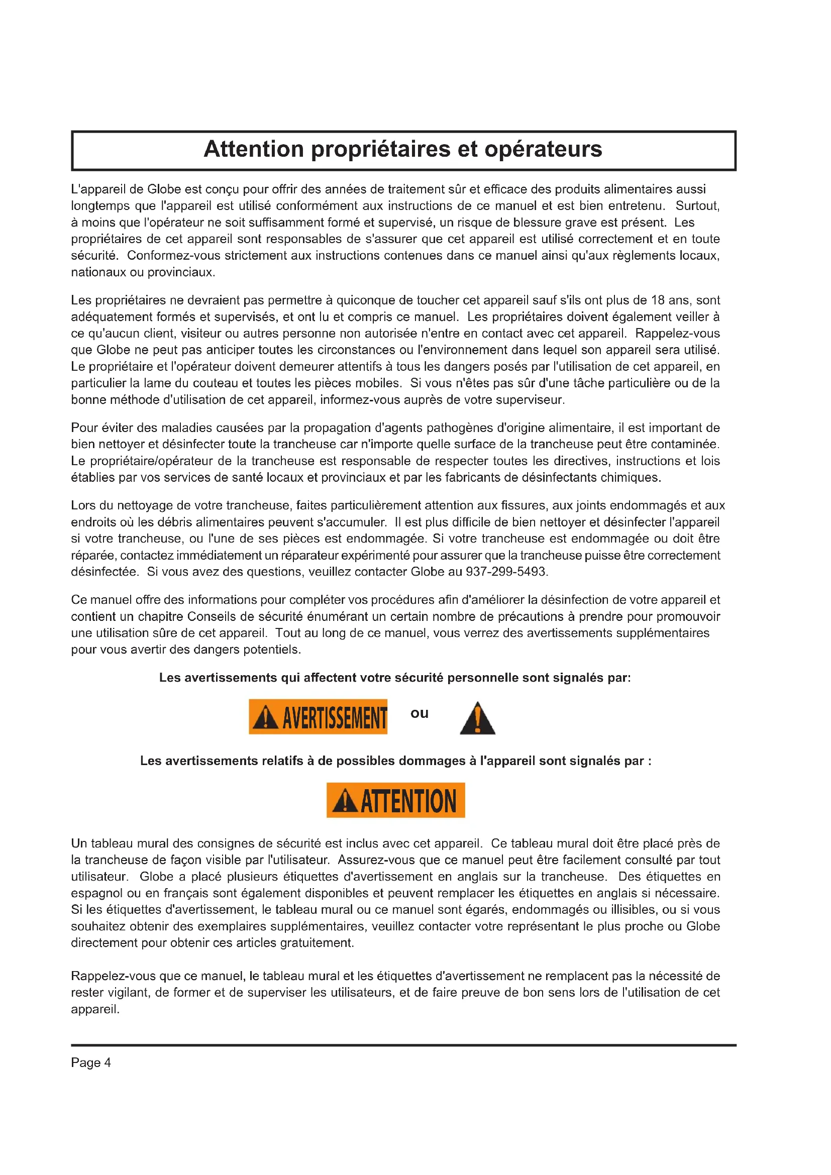 l'utilisation si vous avez des questions ou ne comprenez pas tout dans ce manuel. Contactez d'abord votre représentant local ou Globe. Assurez-vous de nettoyer et désinfecter entièrement votre trancheuse avant son utilisation. Reportez-vous à ce manuel pour des conseils de nettoyage et de désinfection.