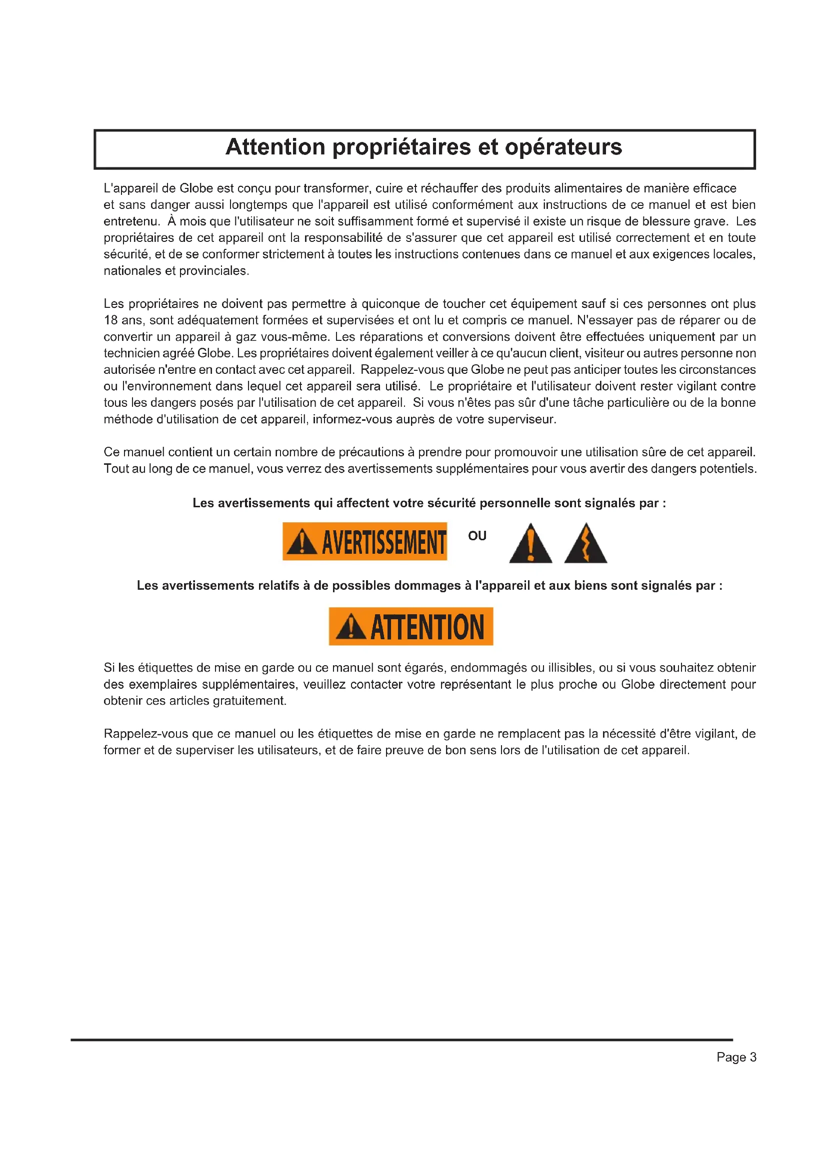LISEZ LE CODE QR AVEC VOTRE APPAREIL MOBILE OU ALLEZ SUR WWW.GLOBEFOODEQUIP.COM POUR REMPLIR ET SOUMETTRE VOTRE GARANTIE. www.globefoodequip.com/support/warranty-registration-formPage 3 L'appareil de Globe est conçu pour transformer, cuire et réchauffer des produits alimentaires de manière efcace et sans danger aussi longtemps que l'appareil est utilisé conformément aux instructions de ce manuel et est bien entretenu. À mois que l'utilisateur ne soit sufsamment formé et supervisé il existe un risque de blessure grave. Les propriétaires de cet appareil ont la responsabilité de s'assurer que cet appareil est utilisé correctement et en toute sécurité, et de se conformer strictement à toutes les instructions contenues dans ce manuel et aux exigences locales, nationales et provinciales. Les propriétaires ne doivent pas permettre à quiconque de toucher cet équipement sauf si ces personnes ont plus 18 ans, sont adéquatement formées et supervisées et ont lu et compris ce manuel. N'essayer pas de réparer ou de convertir un appareil à gaz vous-même. Les réparations et conversions doivent être effectuées uniquement par un technicien agréé Globe. Les propriétaires doivent également veiller à ce qu'aucun client, visiteur ou autres personne non autorisée n'entre en contact avec cet appareil. Rappelez-vous que Globe ne peut pas anticiper toutes les circonstances ou l'environnement dans lequel cet appareil sera utilisé. Le propriétaire et l'utilisateur doivent rester vigilant contre tous les dangers posés par l'utilisation de cet appareil. Si vous n'êtes pas sûr d'une tâche particulière ou de la bonne méthode d'utilisation de cet appareil, informez-vous auprès de votre superviseur. Ce manuel contient un certain nombre de précautions à prendre pour promouvoir une utilisation sûre de cet appareil. Tout au long de ce manuel, vous verrez des avertissements supplémentaires pour vous avertir des dangers potentiels. Les avertissements qui affectent votre sécurité personnelle sont signalés par :