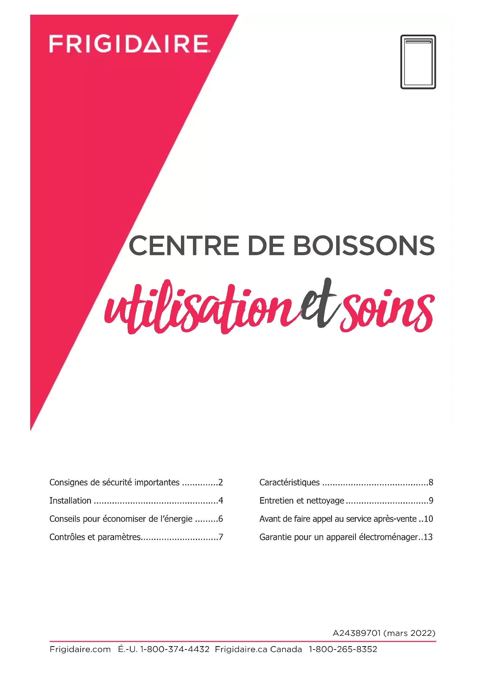 heuresnormalesdebureau,enndesemaineoupendantunjourférié;lesdroitsdepéage; les frais de convoyage ou les frais de déplacement pour les appels de service dans des endroits isolés, notamment l'État de l'Alaska. 12.Lesdommagescausésaunidel'appareilouàlamaisonpendantl'installation,ycompris,sans s'y limiter, aux planchers, aux armoires, aux murs, etc. 13.Lesdommagescauséspar:desréparationseectuéespardestechniciensnonautorisés;l'utilisation de pièces autres que les pièces Electrolux d'origine ou qui n'ont pas été obtenues par l'entremise d'un réparateurautorisé;oulescausesétrangèrescommeuneutilisationabusiveouinappropriée,une alimentation électrique inadéquate, un accident, un incendie ou une catastrophe naturelle. AVERTISSEMENT CONCERNANT LES GARANTIES IMPLICITES; LIMITATIONS DES RECOURS L'UNIQUE RECOURS DU CLIENT EN VERTU DE CETTE GARANTIE LIMITÉE EST LA RÉPARATION OU LE REMPLACEMENT DU PRODUIT SELON LES TERMES DE LA PRÉSENTE. LES RÉCLAMATIONS BASÉES SUR DES GARANTIES IMPLICITES, Y COMPRIS LES GARANTIES IMPLICITES DE QUALITÉ MARCHANDE OU D'ADAPTATION À UN USAGE PARTICULIER, SONT LIMITÉES À UN AN OU À LA PÉRIODE LA PLUS COURTE PERMISE PAR LA LOI, QUI NE DOIT PAS ÊTRE INFÉRIEURE À UN AN. ELECTROLUX NE POURRA ÊTRE TENUE RESPONSABLE DES DOMMAGES ACCESSOIRES OU INDIRECTS NI DES DOMMAGES MATÉRIELS ET DES DÉPENSES IMPRÉVUES RÉSULTANT D'UNE VIOLATION DE CETTE GARANTIE ÉCRITE OU DE TOUTE AUTRE GARANTIE IMPLICITE. CERTAINS ÉTATS ET CERTAINES PROVINCES NE PERMETTENT AUCUNE RESTRICTION OU EXEMPTION SUR LES DOMMAGES ACCESSOIRES OU INDIRECTS NI RESTRICTION SUR LES GARANTIES IMPLICITES. DANS CE CAS, CES RESTRICTIONS OU EXEMPTIONS POURRAIENT NE PAS ÊTRE APPLICABLES. CETTE GARANTIE ÉCRITE VOUS DONNE DES DROITS LÉGAUX PRÉCIS. IL SE PEUT QUE VOUS AYEZ D'AUTRES DROITS VARIANT SELON L'ÉTAT OU LA PROVINCE. Si vous avez besoin d’une réparation Conservez votre reçu, votre bon de livraison ou une autre preuve valide de paiement pour établir la période de la garantie dans le cas où vous devriez faire appel aux services d'un technicien autorisé. Siuneréparationdoitêtreeectuée,veuillezobteniretconservertouslesreçus. Le service auquel vous avez recours en vertu de cette garantie doit être obtenu en communiquant avec Electrolux aux adresses ou aux numéros de téléphone indiqués ci-dessous. Cette garantie n'est valide qu'aux États-Unis et au Canada. Aux États-Unis, votre appareil est garanti par Electrolux Major Appliances North America, une division d'Electrolux Home Products, Inc. Au Canada, votre appareilestgarantiparElectroluxCanadaCorp.Personnen'estautoriséàmodierlesobligationscontenues dans cette garantie ni d'y ajouter quelque élément que ce soit. Les obligations de cette garantie concernant la réparation et les pièces doivent être remplies par Electrolux ou par une compagnie de réparation autorisée.Lescaractéristiquesetlesspécicationsdécritesouillustréespeuventêtremodiéessans préavis. Exclusions ÉTATS-UNIS1 800 374-4432FrigidaireNorth America10200 David Taylor Drive Charlotte, NC 28262 CANADA1 800 265-8352Electrolux Canada Corp.5855 Terry Fox WayMississauga, Ontario, L5V 3E4Frigidaire.com 1 800 374-4432 Frigidaire.ca 1 800 265-8352 assistance accessoires service Notre maison est votre maison. Visitez- nous si vous avez besoin d’aide pour: inscription (Consultez votre carte d’inscription pour plus d’informations.) bienvenue aueil