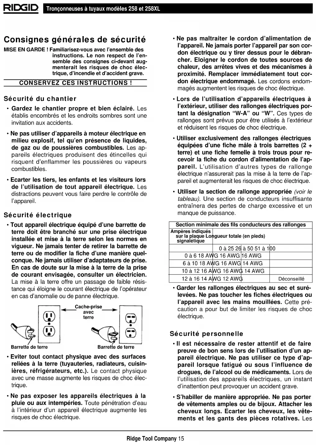 - S’habiller de manière appropriée. Ne pas porter de vêtements amples ou de bijoux. Attacher les cheveux longs. Ecarter les cheveux, les vête- ments et les gants des pièces rotatives. Les Barrette de terreCache-priseavec terreBarrette de terre Section minimale des fils conducteurs des rallonges Ampères indiquéssur la plaque Longueur totale (en pieds)signalétique 0 à 25 26 à 50 51 à 100 0 à 6 18 AWG 16 AWG 16 AWG 6 à 10 18 AWG 16 AWG 14 AWG 10 à 12 16 AWG 16 AWG 14 AWG 12 à 16 14 AWG 12 AWG DéconseilléTronçonneuses à tuyaux modèles 258 et 258XL Ridge Tool Company16 tionnement de l’appareil. Le cas échéant, faire réparer l’appareil avant de l’utiliser. De nom- breux accidents sont le résultat d’un appareil mal entretenu.