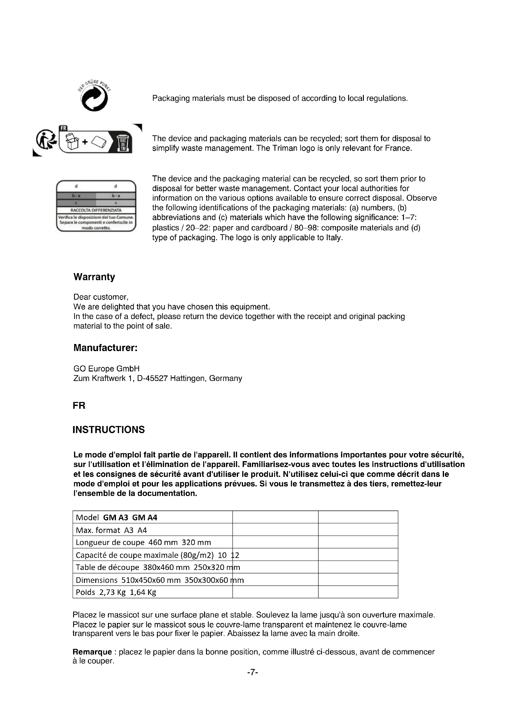 INSTRUCTIONS Le mode d'emploi fait partie de l'appareil. Il contient des informations importantes pour votre sécurité, sur l'utilisation et l'élimination de l'appareil. Familiarisez-vous avec toutes les instructions d'utilisation et les consignes de sécurité avant d'utiliser le produit. N'utilisez celui-ci que comme décrit dans le mode d'emploi et pour les applications prévues. Si vous le transmettez à des tiers, remettez-leur l'ensemble de la documentation. Model GM A3 GM A4 Max. format A3 A4 Longueur de coupe 460 mm 320 mm Capacité de coupe maximale (80g/m2) 10 12 Table de découpe 380x460 mm 250x320 mm Dimensions 510x450x60 mm 350x300x60 mm Poids 2,73 Kg 1,64 Kg Placez le massicot sur une surface plane et stable. Soulevez la lame jusqu'à son ouverture maximale. Placez le papier sur le massicot sous le couvre-lame transparent et maintenez le couvre-lame transparent vers le bas pour fixer le papier. Abaissez la lame avec la main droite. Remarque : placez le papier dans la bonne position, comme illustré ci-dessous, avant de commencer à le couper.-8-