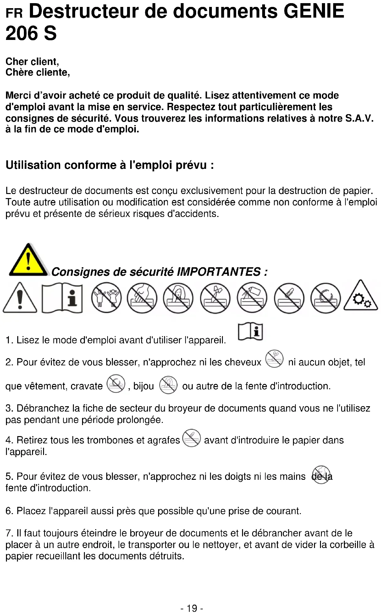 206 S - Destructeur de document Genie - Notice d'utilisation et mode d'emploi gratuit