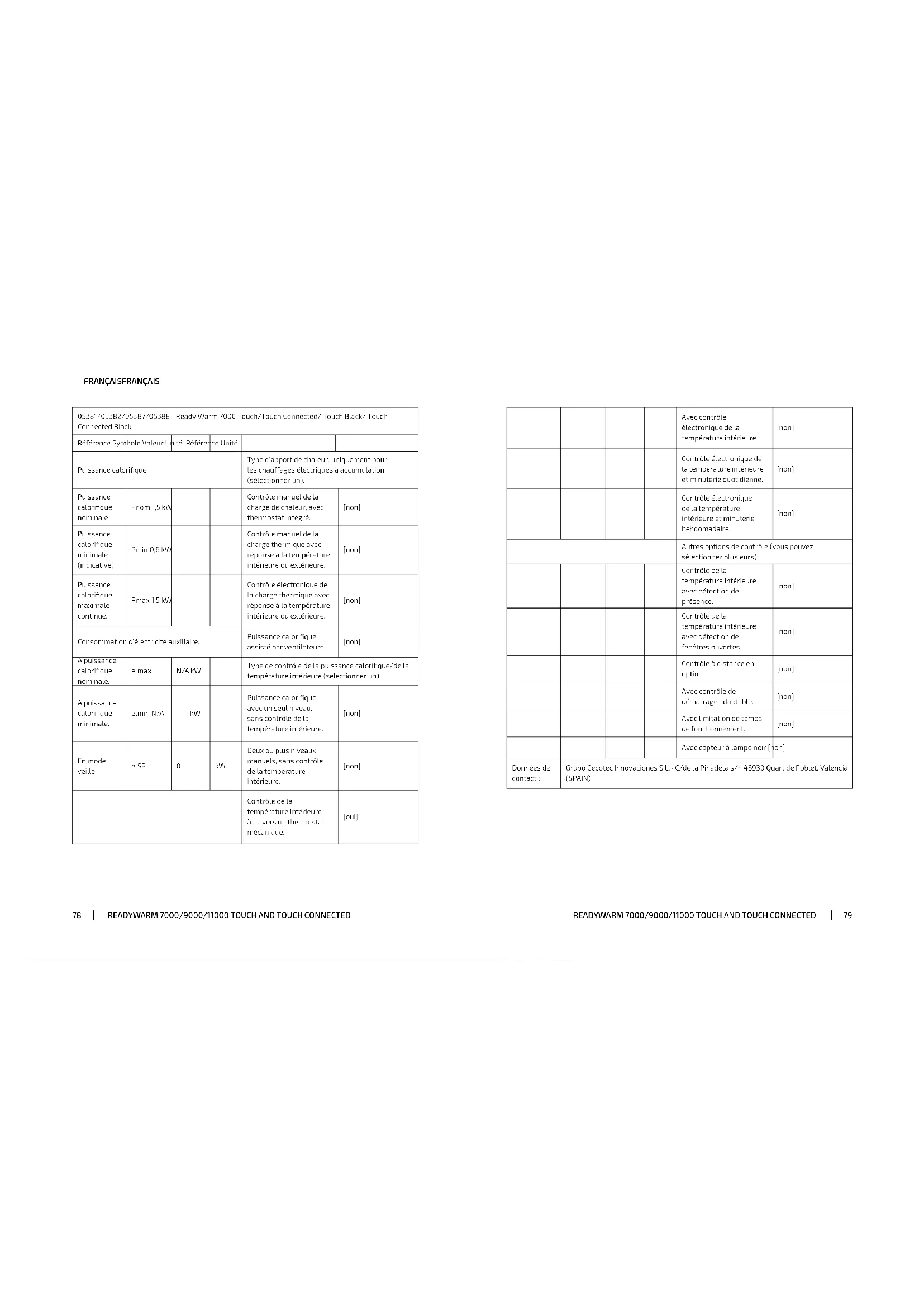 Avec contrôle électronique de la température intérieure. [non] Contrôle électronique de la température intérieure et minuterie quotidienne. [non] Contrôle électronique de la température intérieure et minuterie hebdomadaire. [non] Autres options de contrôle (vous pouvez sélectionner plusieurs). Contrôle de la température intérieure avec détection de présence. [non] Contrôle de la température intérieure avec détection de fenêtres ouvertes. [non] Contrôle à distance en option. [non] Avec contrôle de démarrage adaptable. [non] Avec limitation de temps de fonctionnement. [non] Avec capteur à lampe noir [non] Données de contact : Grupo Cecotec Innovaciones S.L. · C/de la Pinadeta s/n 46930 Quart de Poblet, Valencia (SPAIN) 05381/05382/05387/05388_ Ready Warm 7000 Touch/Touch Connected/ Touch Black/ Touch Connected Black Référence Symbole Valeur Unité Référence Unité Puissance calorique Type d’apport de chaleur, uniquement pour les chauffages électriques à accumulation (sélectionner un). Puissance calorique nominale Pnom 1,5 kW Contrôle manuel de la charge de chaleur, avec thermostat intégré. [non] Puissance calorique minimale (indicative). Pmin 0,6 kW Contrôle manuel de la charge thermique avec réponse à la température intérieure ou extérieure. [non] Puissance calorique maximale continue. Pmax 1,5 kW Contrôle électronique de la charge thermique avec réponse à la température intérieure ou extérieure. [non] Consommation d’électricité auxiliaire. Puissance calorique assisté par ventilateurs. [non] A puissance calorique nominale. elmax N/A kW Type de contrôle de la puissance calorique/de la température intérieure (sélectionner un). A puissance calorique minimale. elmin N/A kW Puissance calorique avec un seul niveau, sans contrôle de la température intérieure. [non] En mode veille elSB 0 kW Deux ou plus niveaux manuels, sans contrôle de la température intérieure. [non] Contrôle de la température intérieure à travers un thermostat mécanique. [oui]READYWARM 7000/9000/11000 TOUCH AND TOUCH CONNECTEDREADYWARM 7000/9000/11000 TOUCH AND TOUCH CONNECTED 8180