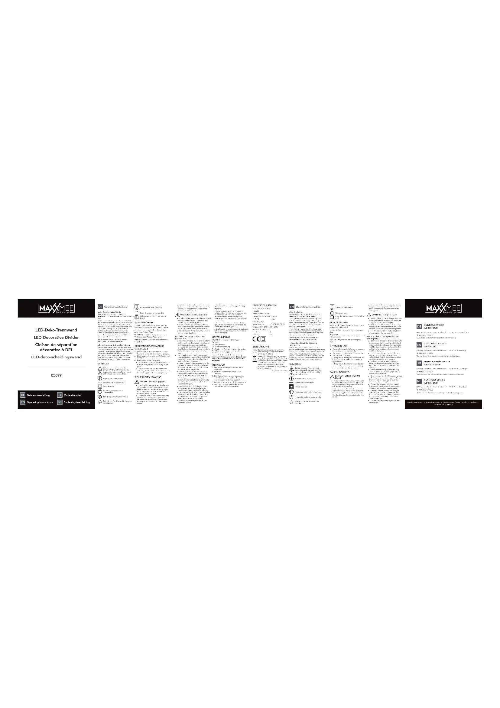 Chère cliente, cher client, Nous vous félicitons d’avoir fait l’acquisition de notre cloison de séparation décorative àDEL MAXXMEE. Son aspect d’osier naturel est un classique indémodable qui ravit tous les regards. Quand la pièce s’assombrit, les DEL à lumière blanche chaude de chaque brin font leur effet et créent une ambiance chaleureuse dans toute la pièce.Pour toute question concernant ce produit et ses pièces de rechange et accessoires, veuillez vous adresser au service après-vente via notre site Internet: www.dspro.de/kundenserviceNous espérons que votre cloison de séparation décorative à DEL MAXXMEE vous donnera entière satisfaction. Informations sur le mode d’emploi Veuillez lire attentivement le présent mode d’emploi avant la première utilisation du pro-duit et le conserver précieusement pour toute question ultérieure ainsi que pour les autres utilisateurs. Il fait partie intégrante du produit. Le fabricant et l’importateur déclinent toute responsabilité en cas de non-observation des instructions consignées dans le mode d’emploi. SYMBOLES Symboles de danger: ces symboles signalent des possibles dangers. Lire et observer attentivement les consignes de sécurité correspondantes.Informations complémentairesSigne de commutation pour le courant continuClasse de protection IIConvertisseur/ transformateur indépendant