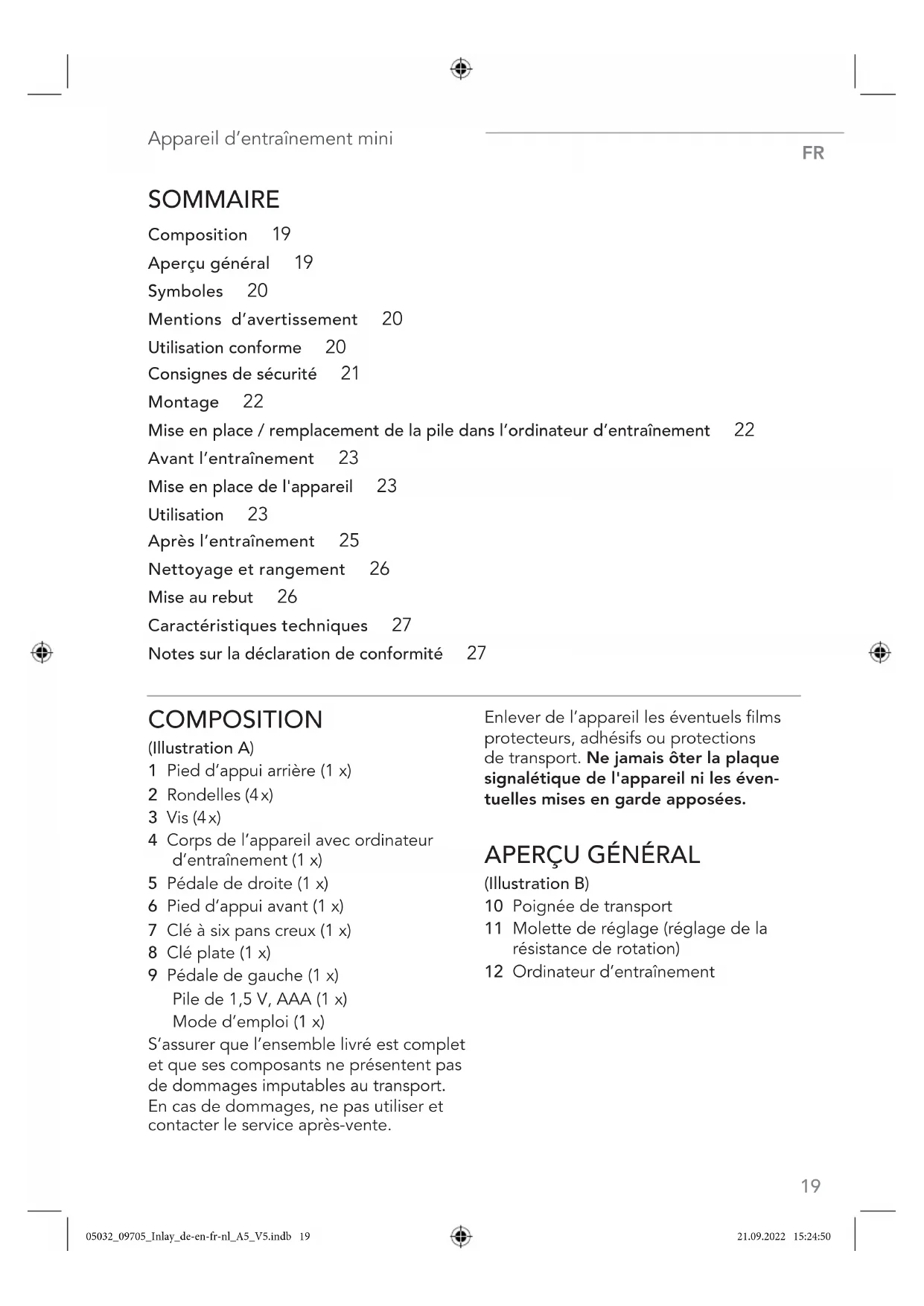 traînement dans le corps de l’appareil. Si l’ordinateur d'entraînement ne fonc- tionne plus, les piles doivent être rempla- cées. 05032_09705_Inlay_de-en-fr-nl_A5_V5.indb 2205032_09705_Inlay_de-en-fr-nl_A5_V5.indb 22 21.09.2022 15:24:5021.09.2022 15:24:50Appareil d’entraînement mini