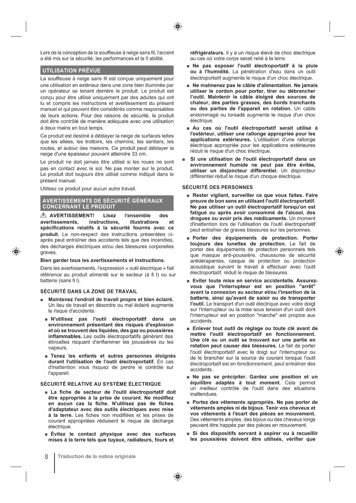 Traduction de la notice originale■ Faites attention à ne pas glisser ou tomber, en particulier lorsque vous utilisez l'appareil en marche arrière. ■ Réglez la hauteur du châssis de la pelle afin de ne pas entrer en contact avec le gravier ou de racler les surfaces en pierre. ■ Ne tentez jamais d'effectuer un réglage lorsque le produit est allumé. ■ Le produit est capable de trancher les mains et les pieds, et de projeter des objets. Le non-respect de toutes les consignes de sécurité peut entraîner des blessures graves. ■ Gardez à l’esprit que l’opérateur est responsable des accidents qui arrivent aux autres personnes présentes dans sa propriété. PRÉPARATION ■ Vérifiez avec soin la zone où vous allez utiliser la machine, et retirez-en tous les paillassons, traîneaux, planches, câbles, et autres objets étrangers. ■ Débrayez tous les embrayages et passez au point mort avant de démarrer le moteur. ■ Lors de l'utilisation de la machine, portez toujours des habits d'hiver adaptés et des chaussures antidérapantes. Évitez tout habillement ample ou comportant des cordons ou cravates qui pendent et seraient susceptibles d'être happés par les pièces en mouvement. ■ Attachez les cheveux longs au-dessus du niveau des épaules afin d'éviter qu'ils ne se prennent dans les parties en mouvement. ■ Portez toujours des lunettes de sécurité ou des protecteurs oculaires lors de l'utilisation, du réglage ou de la réparation afin de vous protéger les yeux des objets étrangers qui pourraient être projetés par le produit. ■ Avant chaque utilisation assurez-vous que toutes les commandes et tous les organes de sécurité fonctionnent correctement. N'utilisez pas le produit si l'interrupteur « arrêt » (off) ne déclenche pas l'arrêt du produit. ■ Avant chaque utilisation, vérifiez toujours si le boîtier est endommagé et assurez-vous que les poignées et protections sont en place et correctement fixées. UTILISATION ■ N'utilisez pas le produit en cas de risque d'éclair. ■ Ne mettez pas vos pieds ou vos mains sous les pièces en rotation ou à leur proximité. Restez en permanence à l’écart de la trappe d’éjection. N'introduisez aucun objet dans les ouvertures de l'appareil. ■ Soyez extrêmement prudent lors de l'utilisation de l'appareil sur des allées ou des trottoirs en gravier ou en traversant ces derniers. Faites attention aux dangers cachés ou lorsque que vous travaillez près de routes publiques. ■ Pour réduire les risques de blessures infligées par des pièces mobiles, mettez toujours l'appareil hors tension avant de retirer le bloc-batterie. Assurez-vous que tous les éléments en mouvement se sont bien arrêtés: ● après avoir heurté un objet étranger afin de vérifier les dommages éventuels subis par le produit ● avant de nettoyer ou de dégager la cause d'un blocage ● avant de laisser le produit sans surveillance ● avant de travailler sur le produit, de le vérifier ou de l'entretenir ● si le produit se met à vibrer de façon anormale, effectuez immédiatement ce qui suit Les vibrations sont souvent le signe d’un problème. ■ Utilisez le produit transversalement par rapport à la pente, jamais en la remontant ou en la descendant. Redoublez de vigilance lorsque vous changez de direction dans une pente. Ne tentez pas de déneiger les fortes pentes. ■ N'utilisez jamais un produit dont les protections, platines, ou autres dispositifs de sécurité ne sont pas en place. ■ N'orientez jamais le dégagement de neige vers des personnes ou des zones où des biens pourraient être endommagés. Eloignez tous les passants de la zone de travail, en particulier les enfants et les animaux. ■ Ne surchargez pas la machine au-delà de ses capacités en tentant de dégager la neige trop vite. ■ Ne jamais utiliser le produit lors d'un déplacement à vitesse élevée sur des surfaces glissantes. Regardez derrière vous et soyez prudent(e) lorsque vous utilisez le produit en marche arrière. ■ Désactivez l'alimentation de la pelle/turbine lors du transport ou du stockage de l'appareil. ■ N'utilisez que des pièces détachées et des accessoires d'origine constructeur. ■ N'utilisez jamais le produit sans disposer d'une bonne visibilité ou d'un bon éclairage. Assurez-vous d'être toujours stable sur vos jambes et de tenir fermement les poignées. Marchez, ne courrez jamais. ■ Ne posez jamais le produit avec le moteur en marche sur une surface quelconque à moins qu'elle ne soit propre et dure. Le gravier, le sable, et autres débris peuvent être aspirés par l'entrée d'air et projetés vers l'opérateur ou les passants, risquant de provoquer de graves blessures. ■ N'utilisez jamais le produit à proximité d'enclos en verre, de voitures, de fenêtres, ou d'embrasures de portes sans avoir réglé l'angle d'évacuation de la neige en conséquence. ■ Si le produit tombe, subit un lourd impact ou commence à vibrer de manière anormale, l'arrêter immédiatement et l'examiner pour détecter la présence de dommages ou identifier la cause des vibrations. Toute pièce endommagée doit être correctement remplacée ou réparée par un centre de service agréé. ■ Utilisez le produit uniquement à des températures comprises entre 0 et 40 °C. ■ Stockez le produit à un endroit dont la température ambiante est comprise entre 0 et 40 °C.