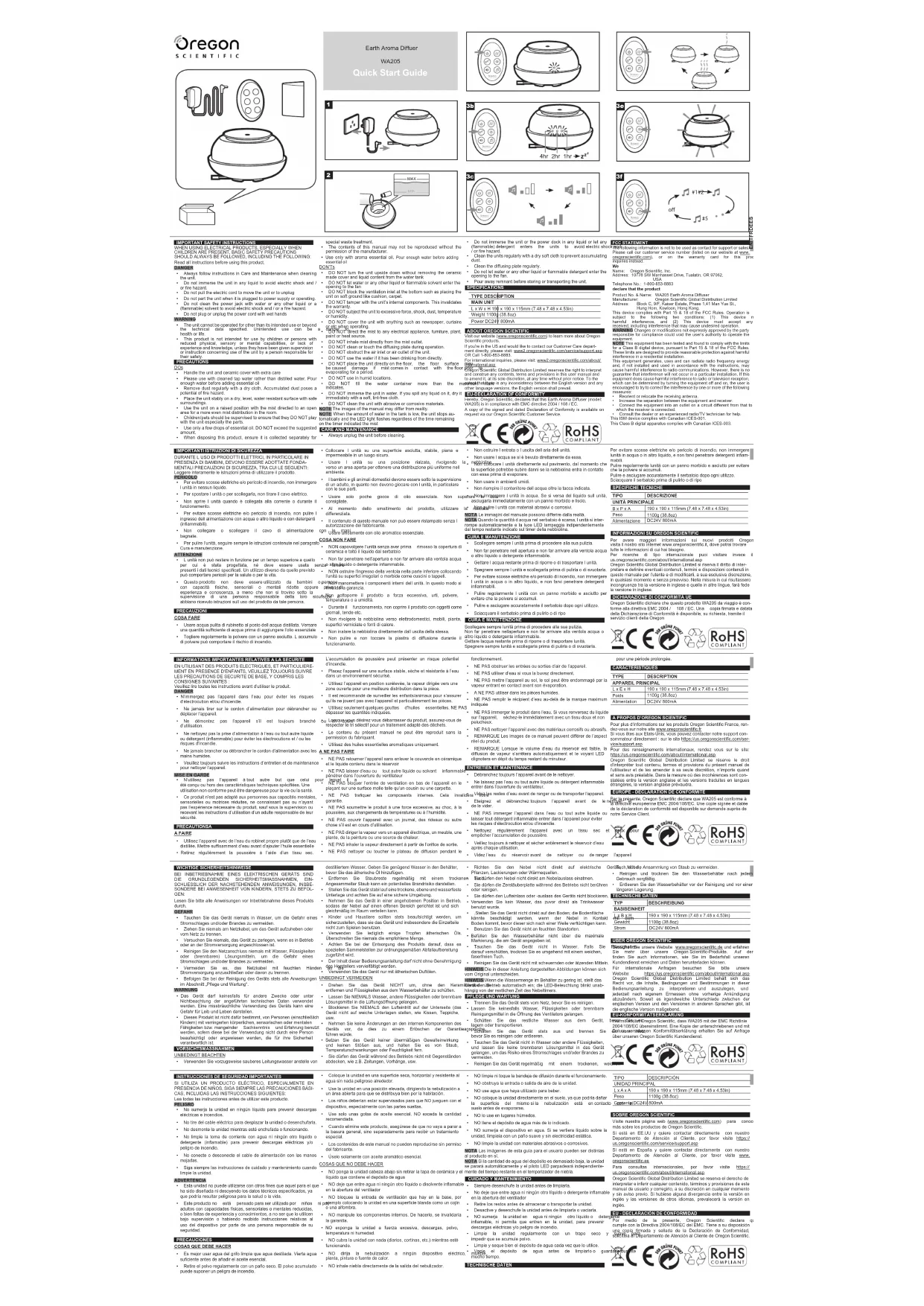 Parlaprésente,OregonScienticdéclarequeWA205estconformeà la directive européenne EMC 2004/108/EC. Une copie signée et datée de la déclaration de conformité est disponible sur demande auprès de notre Service Client. WICHTIGE SICHERHEITSHINWEISE BEI INBETRIEBNAHME EINES ELEKTRISCHEN GERÄTS SIND