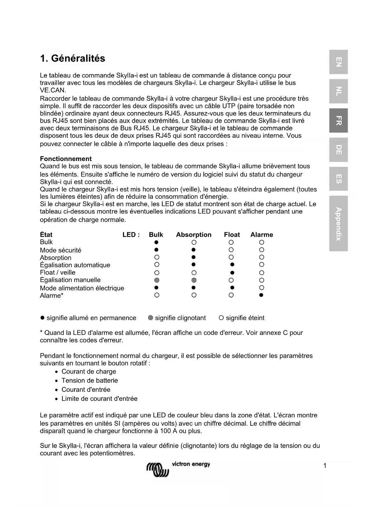 un seul réseau VE.Can Plusieurs tableaux de commande Skylla-i peuvent être connectés à un chargeur ou à un ensemble de chargeurs connectés en parallèle et synchronisés. Aucune configuration n'est nécessaire pour les produits prêts à l'emploi. Le fait de connecter tous les Skylla-i, le tableau de commande et installer les terminateurs est suffisant. Uniquement dans le cas d'installations où plusieurs Skylla-i se trouvent sur le même réseau VE.Can pour charger différents bancs de batterie, les paramètres doivent être modifiés pour éviter qu'ils se synchronisent. Des chargeurs Skylla-i et des tableaux de commande Skylla-i se reconnaissent les uns des autres grâce à l'instance du dispositif. L'instance du dispositif par défaut est zéro à la fois pour les panneaux de commande et les Skylla-i. Pour modifier l'instance du dispositif, utilisez un outil-réseau NMEA2000 comme par exemple Actisen ou Maretron. Pour remettre à zéro manuellement l'instance du dispositif dans le tableau de commande Skylla-i, appuyez sans relâcher pendant 4 secondes sur le bouton-poussoir se trouvant à l'arrière. Après 4 secondes, le tableau de commande redémarrera (toutes les LED s'allumeront temporairement), et l'instance du dispositif sera à zéro.3 EN NL FR DE ES Appendix Consultez la dernière version du manuel du Skylla-i pour connaître la liste d'erreur et les codes d'avertissement. Remarquez que la fonctionnalité mentionnée est disponible depuis le microprogramme v2.00 aussi bien pour le Skylla-i que pour le tableau de commande Skylla-i.1 EN NL FR DE ES Appendix