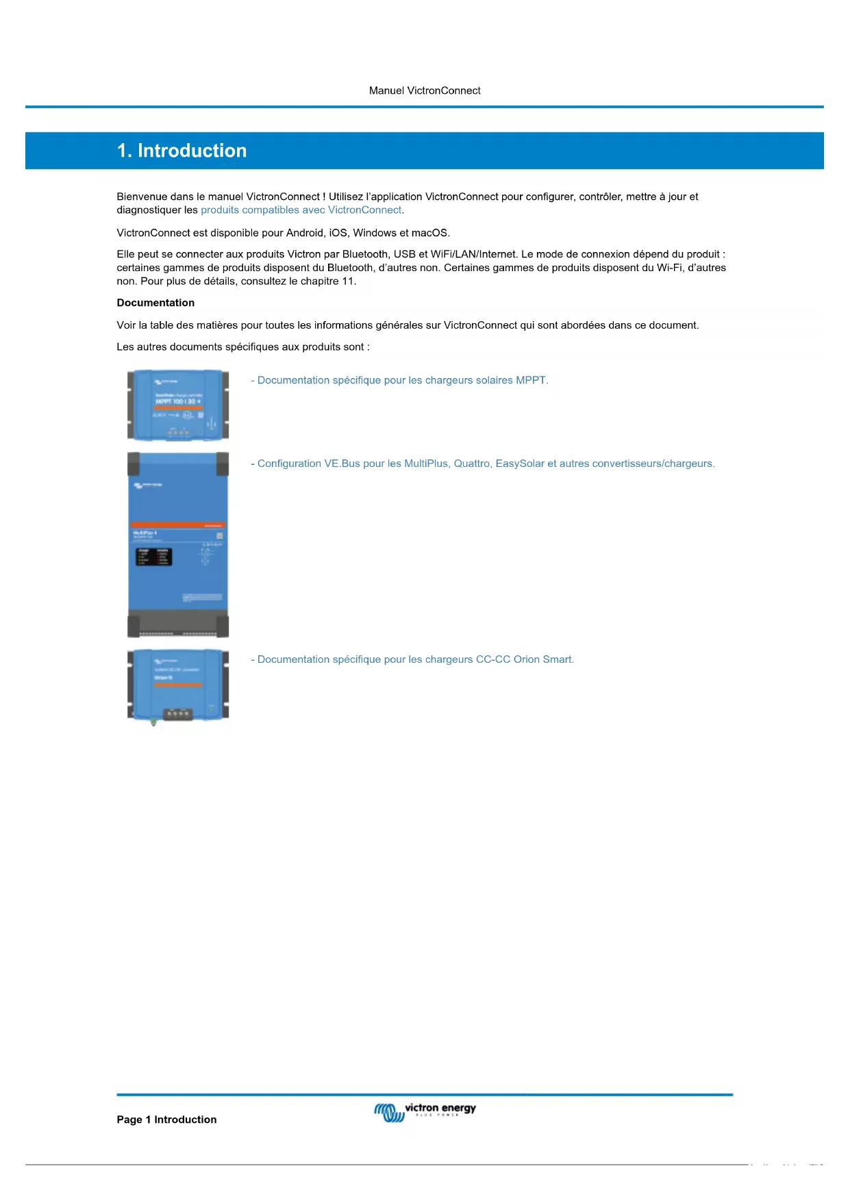 - 13.13. Chargeur de batterie CC-CC Orion XS 12/12-50 A Manuel VictronConnect1. Introduction Bienvenue dans le manuel VictronConnect ! Utilisez l’application VictronConnect pour configurer, contrôler, mettre à jour et diagnostiquer les produits compatibles avec VictronConnect. VictronConnect est disponible pour Android, iOS, Windows et macOS. Elle peut se connecter aux produits Victron par Bluetooth, USB et WiFi/LAN/Internet. Le mode de connexion dépend du produit : certaines gammes de produits disposent du Bluetooth, d’autres non. Certaines gammes de produits disposent du Wi-Fi, d’autres non. Pour plus de détails, consultez le chapitre 11. Documentation Voir la table des matières pour toutes les informations générales sur VictronConnect qui sont abordées dans ce document. Les autres documents spécifiques aux produits sont : - Documentation spécifique pour les chargeurs solaires MPPT. - Configuration VE.Bus pour les MultiPlus, Quattro, EasySolar et autres convertisseurs/chargeurs. - Documentation spécifique pour les chargeurs CC-CC Orion Smart. Manuel VictronConnect Page 1 Introduction2. Téléchargement et installation VictronConnect est disponible pour les utilisateurs de PC sous Windows et MacOS X, ainsi que pour les téléphones et les tablettes iOS et Android. Utilisez ce lien pour télécharger l’application qui vous convient. Elle est aussi disponible pour Linux, mais cette version n’est pas prise en charge officiellement. Reportez-vous au chapitre 4 [6] pour plus de détails sur les téléphones, tablettes et ordinateurs portables compatibles, ainsi que sur les versions du système d’exploitation minimales requises. Manuel VictronConnect Page 2 Téléchargement et installation3. Connexion Il y a trois manières de connecter un produit Victron : Méthode iOS Android PC Windows macOS X Produits avec Bluetooth intégré Oui Oui Non Oui Clé électronique Bluetooth Smart reliée à VE.Direct Oui Oui Non Oui Interface USB-VE.Direct Non Oui (1) Oui Oui (1) Câble USB On-The-Go nécessaire. Ces câbles sont disponibles dans les magasins de téléphones et de réparations de téléphones, ainsi que sur Internet. Consultez le chapitre Produits Victron compatibles pour vérifier la compatibilité de votre produit. 3.1. Bluetooth Smart - Couplage et connexion Pour vous connecter à votre produit Victron par Bluetooth, connectez-vous toujours à partir de VictronConnect. Ne vous connectez pas à partir du menu système du téléphone car VictronConnect ne trouvera pas votre produit Victron. Marche à suivre pour vous connecter : p. 49