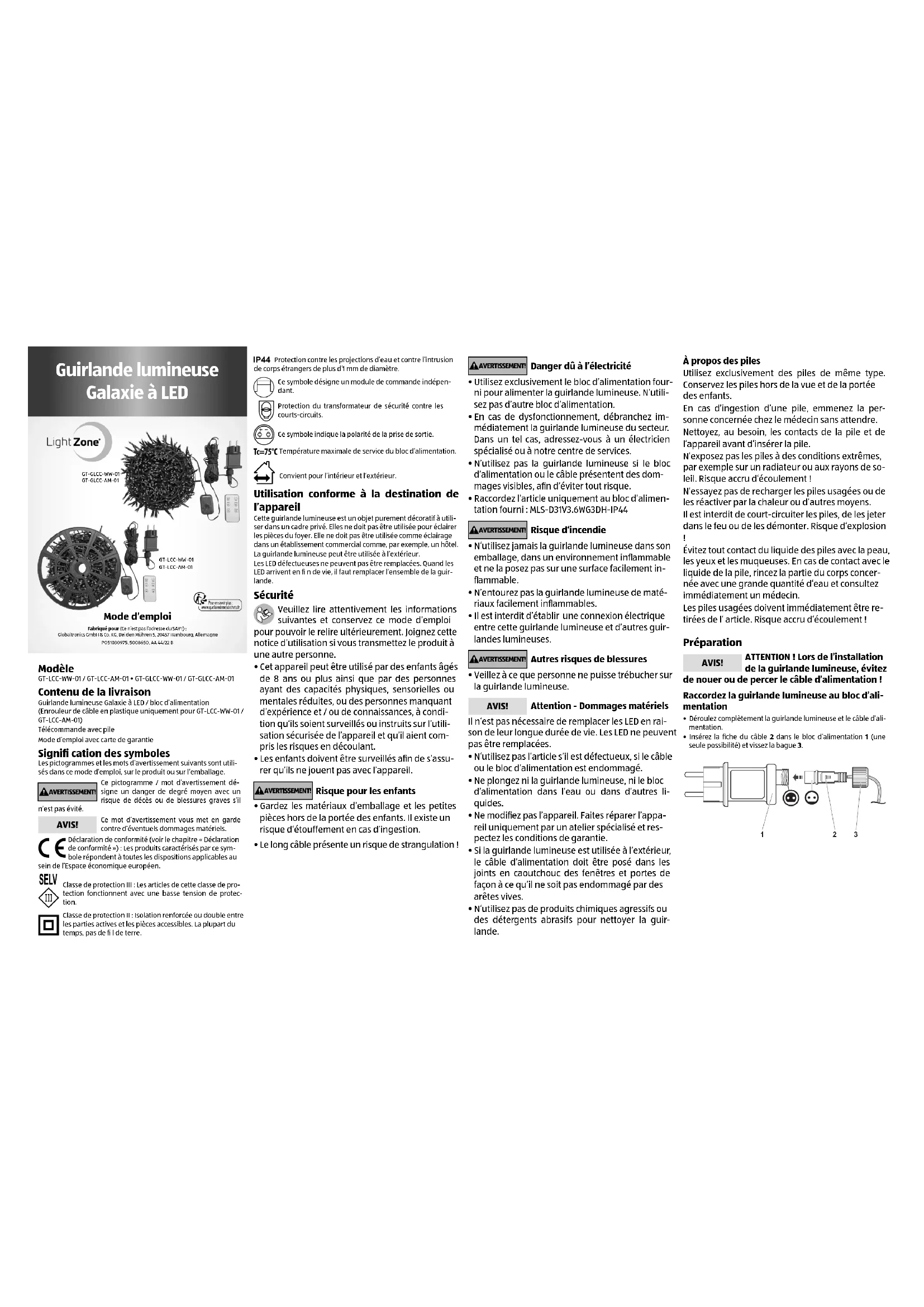 Mode d’emploi Fabriqué pour (Ce n’est pas l’adresse du SAV !) :Globaltronics GmbH & Co. KG, Bei den Mühren 5, 20457 Hambourg, AllemagnePO51030975, 5008650, AA 44/22 B Guirlande lumineuse Galaxie à LED
