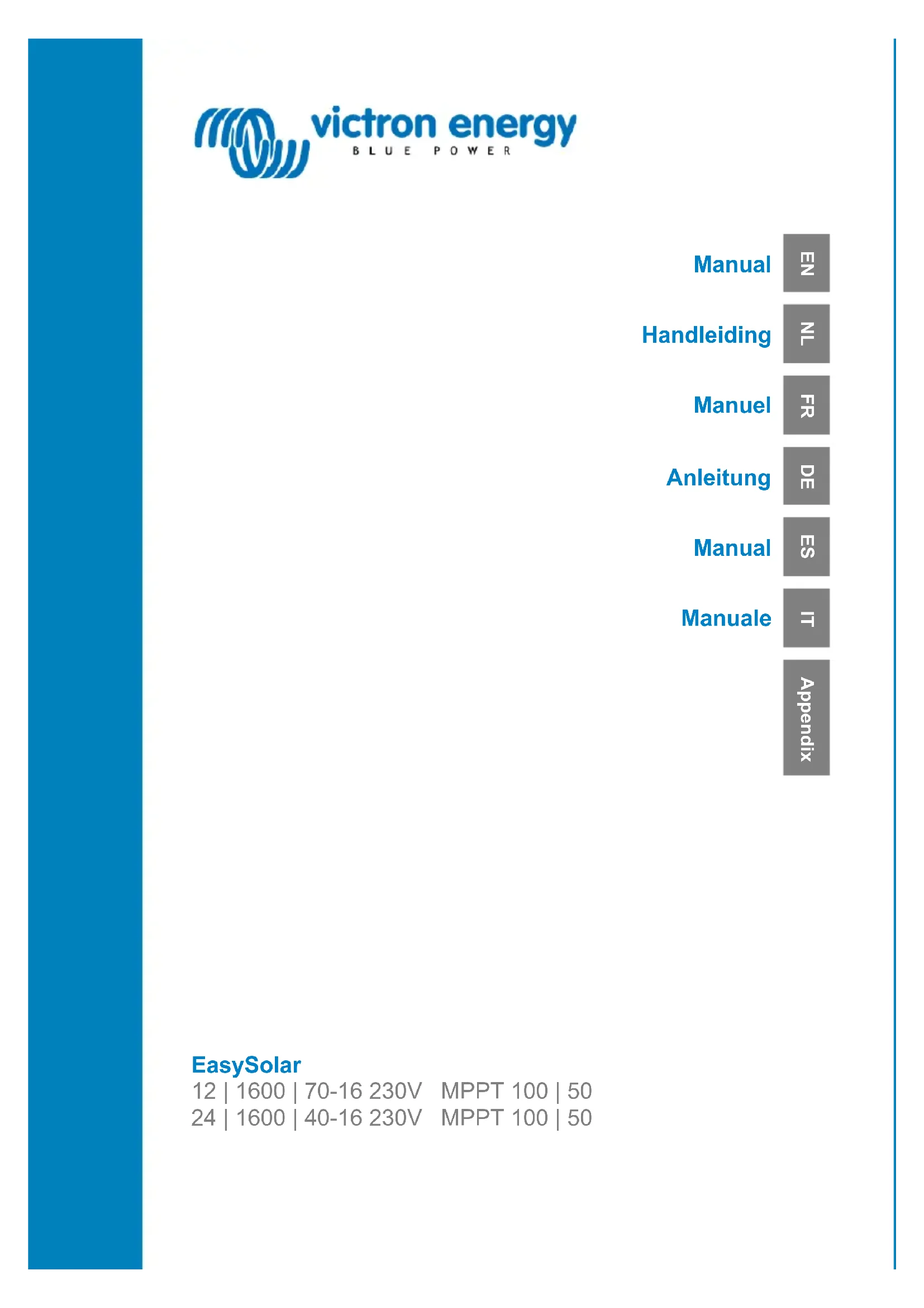Une solution d'énergie solaire tout-en-un : L'EasySolar associe un contrôleur de charge solaire MPPT, un chargeur/convertisseur et une distribution CA dans un seul boîtier. Ce produit est facile à installer, avec un minimum de câblage. Contrôleur de charge solaire : SmartSolar MPPT 100/50 Jusqu'à trois chaînes de panneaux PV peuvent être connectées avec trois ensembles de connecteurs PV MC4. (PV-ST01). Convertisseur/chargeur : MultiPlus Compact 12/1600/70 ou 24/1600/40 Le contrôleur de charge MPPT et le convertisseur/chargeur MultiPlus partagent les câbles de batterie CC (inclus). Les batteries peuvent être chargées par de l'énergie solaire (MPPT) et/ou par l'alimentation CA (convertisseur/chargeur) provenant du réseau public ou d'un générateur. Distribution CA La distribution CA est composée d'un RCD (30 mA/16 A) et de quatre sorties CA protégées par deux disjoncteurs de 10 A et deux de 16 A. Une sortie de 16 A est contrôlée par l'entrée CA : elle ne sera allumée que si une source CA est disponible. PowerAssist La technologie unique PowerAssist protège l'alimentation du réseau ou du générateur contre un risque de surcharge en ajoutant une puissance de convertisseur supplémentaire si cela est nécessaire.3 EN NL FR DE ES IT Appendix