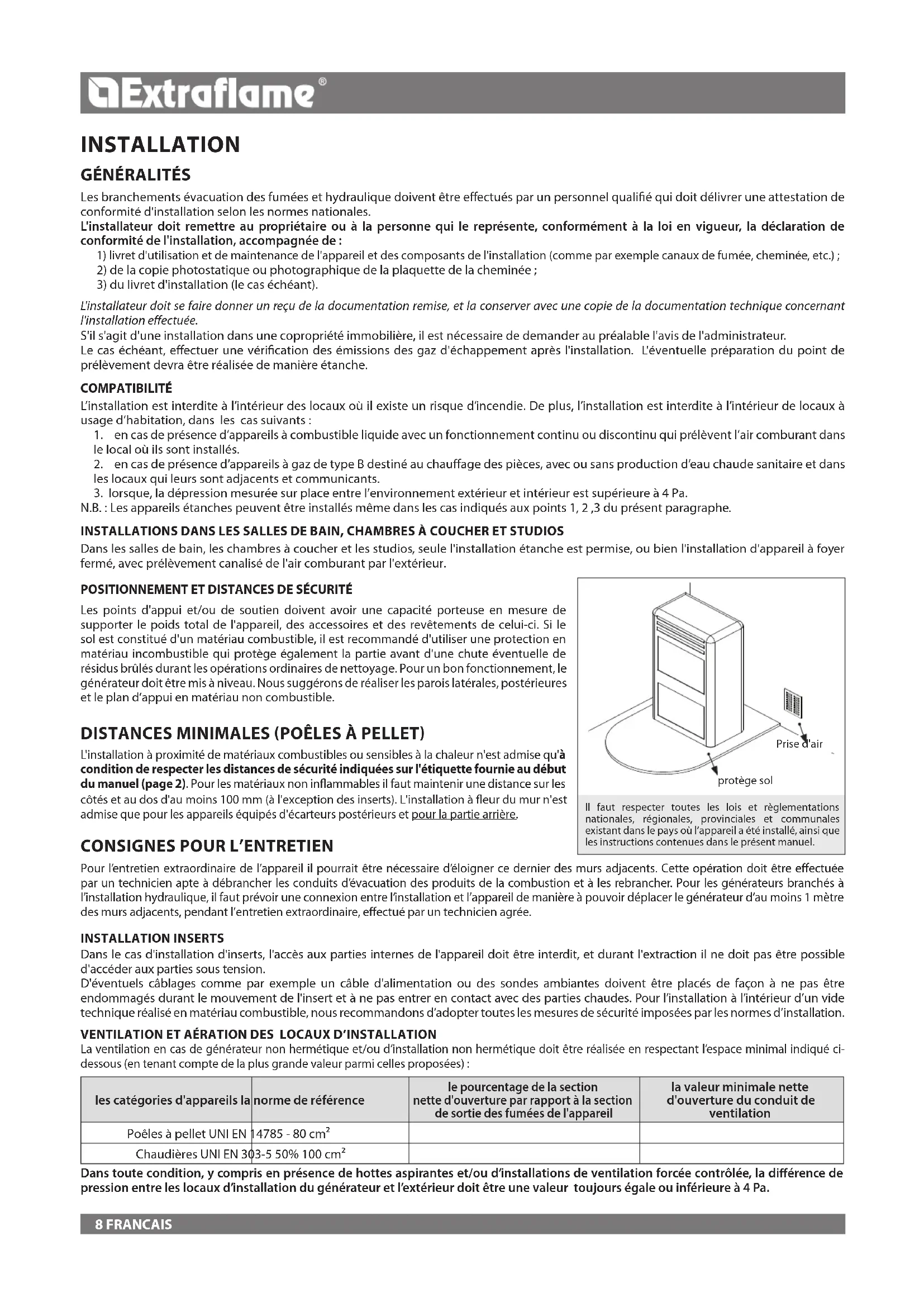 AU COURS DU REMPLISSAGE, VEILLER À CE QUE LE SAC DE PELLETS N'ENTRE PAS EN CONTACT AVEC L'APPAREIL. LES FAïENCES SONT DES PRODUITS ARTISANAUX ET EN TANT QUE TELS, ELLES PEUVENT PRÉSENTER DES MICRO-GRUMEAUX, DES CRAQUELURES ET DES IMPERFECTIONS CHROMATIQUES. CES CARACTÉRISTIQUES EN DÉMONTRENT LA VALEUR. ÉTANT DONNÉ LEUR COEFFICIENT DE DILATATION DIFFÉRENT, L'ÉMAIL ET LA FAïENCE PRODUISENT DES MICRO- FISSURES (CRAQUELURES) QUI TÉMOIGNENT DE LEUR AUTHENTICITÉ. POUR NETTOYER LES FAïENCES, NOUS CONSEILLONS D'UTILISER UN CHIFFON DOUX ET SEC. SI UN DÉTERGENT OU DU LIQUIDE EST UTILISÉ, CE DERNIER POURRAIT PÉNÉTRER À L'INTÉRIEUR DES FISSURES ET LES METTRE EN ÉVIDENCE. ÉTANT DONNÉ QUE L’APPAREIL PEUT S’ALLUMER DE MANIÈRE AUTONOME VIA CHROMOTHÉRAPIE OU À DISTANCE GRÂCE AUX APPLICATIONS DÉDIÉES, IL EST STRICTEMENT INTERDIT DE LAISSER DES OBjETS À L’INTÉRIEUR DES DISTANCES DE SÉCURITÉ INDIQUÉES SUR L’ÉTIQUETTE DES CARACTÉRISTIQUES TECHNIQUES. LES PARTIES INTÉRIEURES DE LA CHAMBRE DE COMBUSTION PEUVENT ÊTRE SUjETTES À L’USURE ESTHÉTIQUE, MAIS CELA N’AFFECTE PAS LEUR FONCTIONNALITÉ. entretien ordinaire Selon le décret du 22 janvier 2008 n°37 art.2, l'expression «entretien ordi- naire» dénit les interventions ayant pour but de contenir la dégradation normale d'usage, et d'aronter les événements accidentels qui comportent la nécessité de premières interventions, qui ne modient cependant pas la structure de l'installation sur laquelle on intervient, ou sa destination d'usage selon les prescriptions prévues par la règlementation technique en vigueur et le manuel d'utilisation et d'entretien du fabricant.8 FRANCAIS INSTALLATION INSERTS Dans le cas d'installation d'inserts, l'accès aux parties internes de l'appareil doit être interdit, et durant l'extraction il ne doit pas être possible d'accéder aux parties sous tension. D'éventuels câblages comme par exemple un câble d'alimentation ou des sondes ambiantes doivent être placés de façon à ne pas être endommagés durant le mouvement de l'insert et à ne pas entrer en contact avec des parties chaudes. Pour l’installation à l’intérieur d’un vide technique réalisé en matériau combustible, nous recommandons d’adopter toutes les mesures de sécurité imposées par les normes d’installation. VENTILATION ET AÉRATION DES LOCAUX D’INSTALLATION La ventilation en cas de générateur non hermétique et/ou d’installation non hermétique doit être réalisée en respectant l’espace minimal indiqué ci- dessous (en tenant compte de la plus grande valeur parmi celles proposées) : les catégories d'appareils la norme de référence le pourcentage de la section nette d'ouverture par rapport à la section de sortie des fumées de l'appareil la valeur minimale nette d'ouverture du conduit de ventilation Poêles à pellet UNI EN 14785 - 80cm² Chaudières UNI EN 303-5 50% 100 cm² INSTALLATION