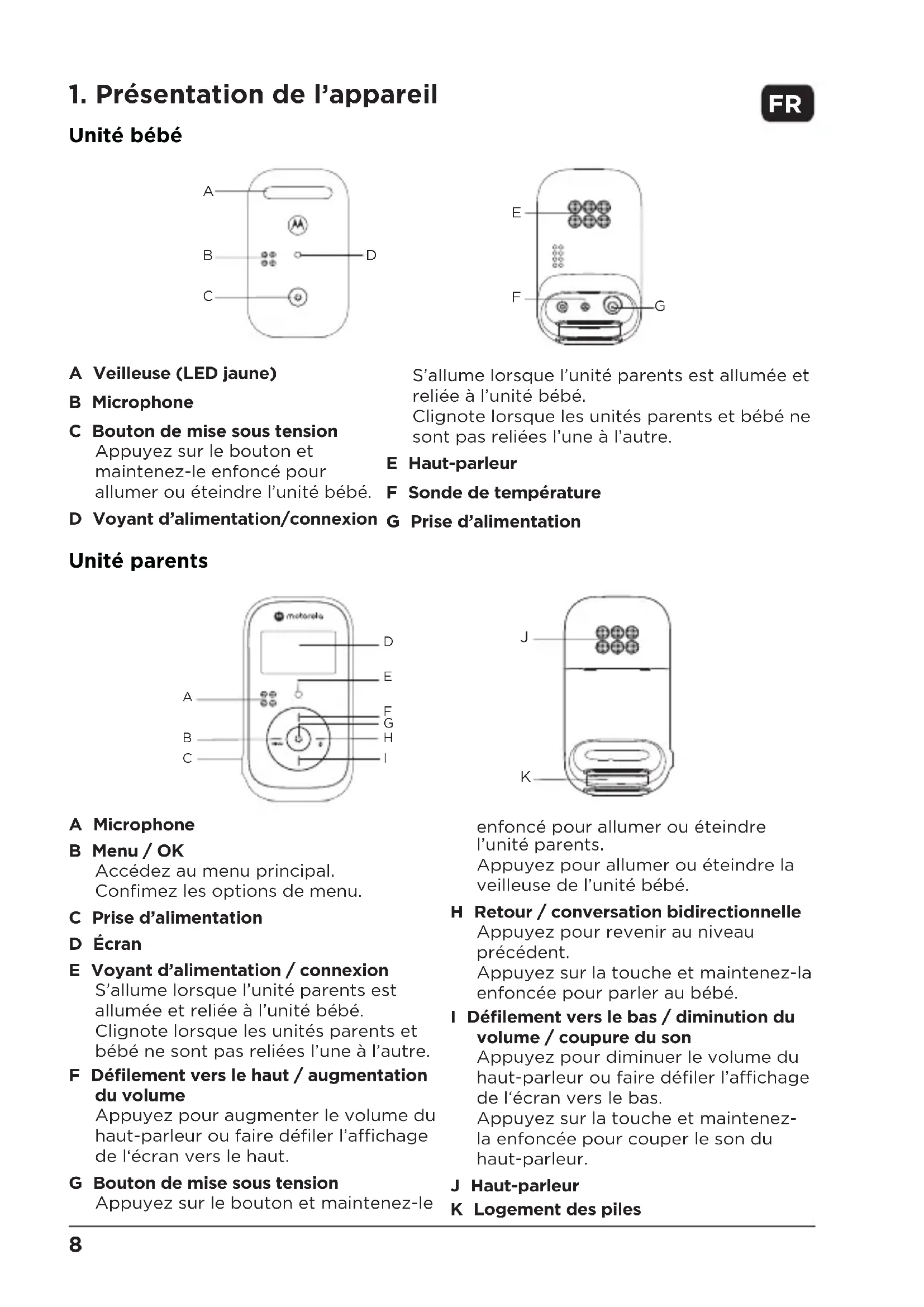 enfoncé pour allumer ou éteindre l’unité parents. Appuyez pour allumer ou éteindre la veilleuse de l’unité bébé. H Retour / conversation bidirectionnelle Appuyez pour revenir au niveau précédent. Appuyez sur la touche et maintenez-la enfoncée pour parler au bébé. I Défilement vers le bas / diminution du volume / coupure du son Appuyez pour diminuer le volume du haut-parleur ou faire défiler l’achage de l‘écran vers le bas. Appuyez sur la touche et maintenez- la enfoncée pour couper le son du haut-parleur. J Haut-parleur K Logement des piles
